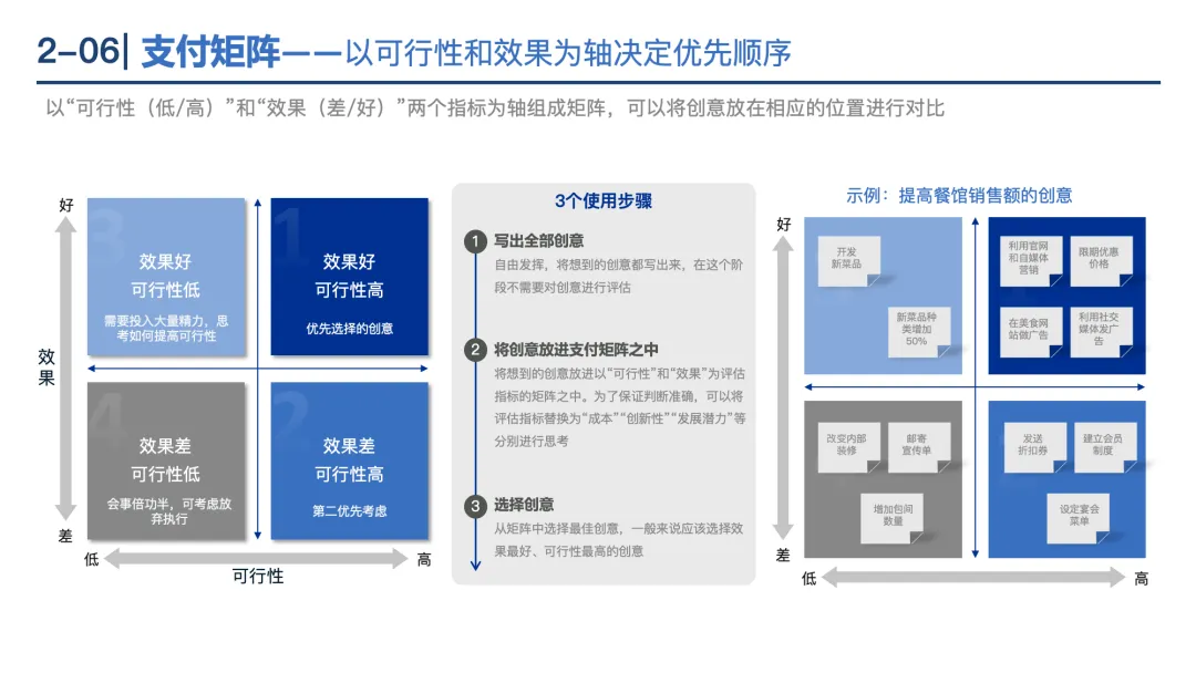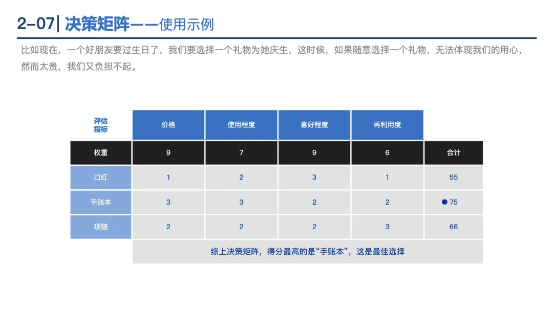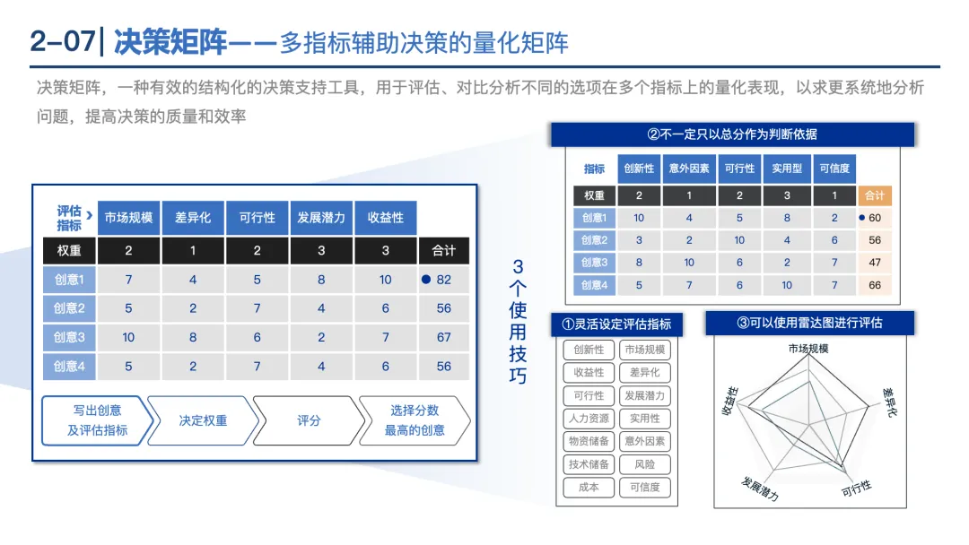 决策矩阵:通过多指标量化评估选项,步骤包括设定指标权重、评分、选择最高分方案,适用于复杂决策。