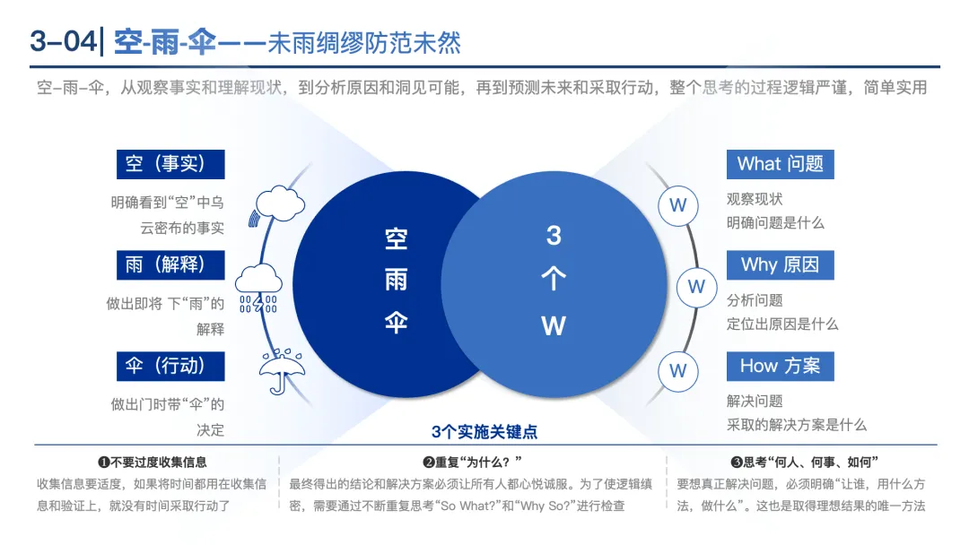 空雨伞:三步思维流程——“空(事实,如乌云密布)→雨(解释,即将下雨)→伞(行动,带伞出门)”,适用于预判和行动。