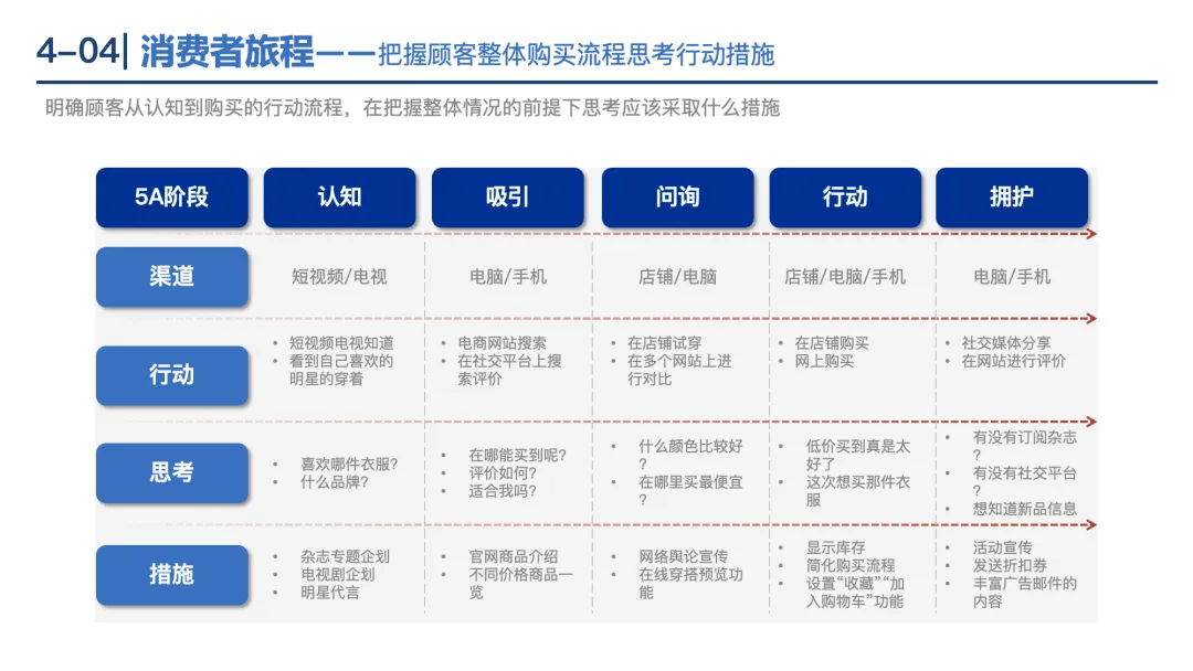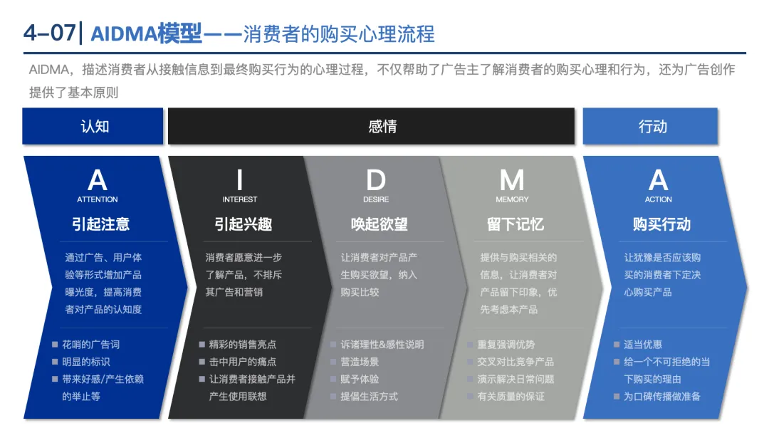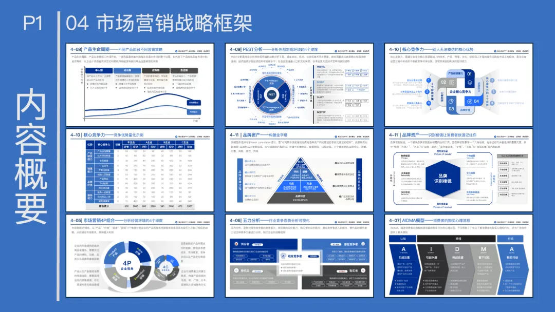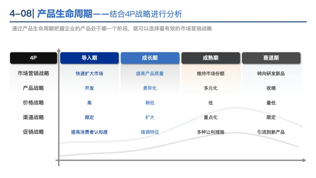 4P组合:从产品(功能、品质)、价格(成本、竞争)、渠道(销售路径)、促销(广告、公关)设计营销策略。
