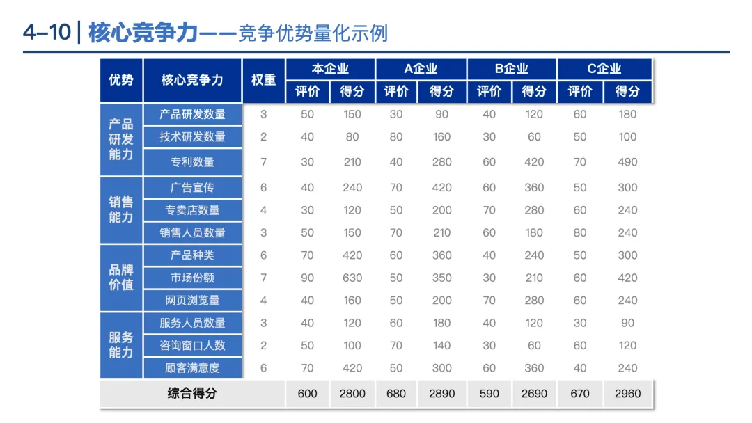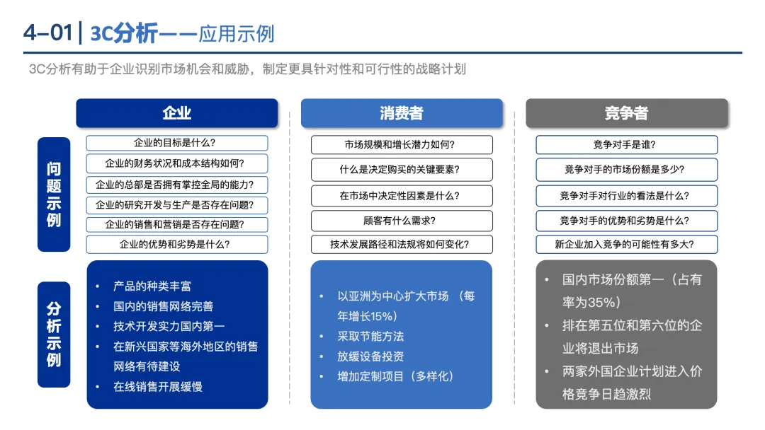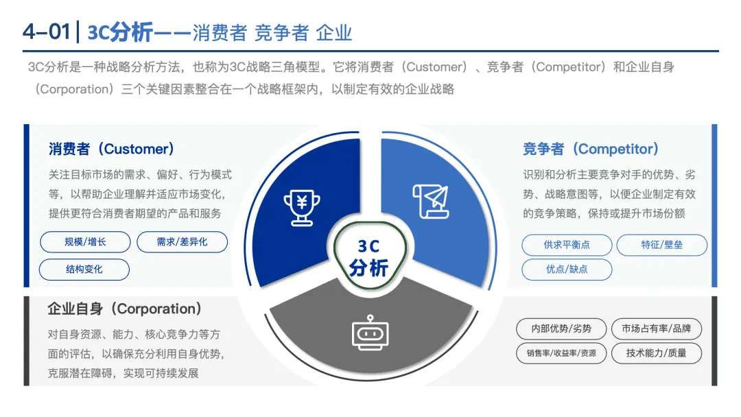3C分析:从消费者(需求、规模)、竞争者(优势、份额)、企业自身(资源、能力)三个维度制定战略。