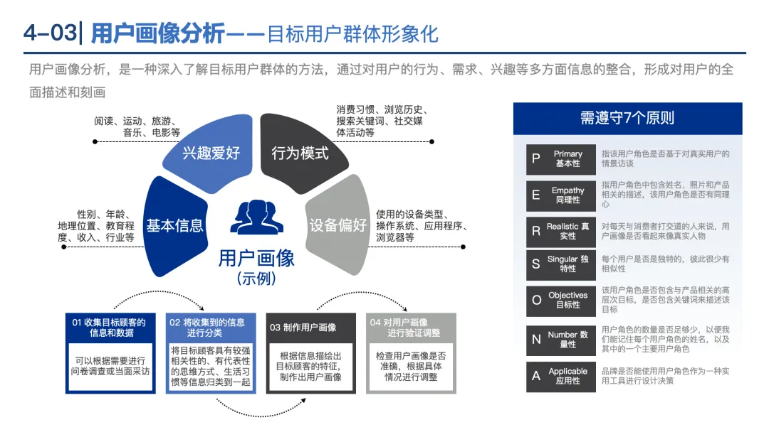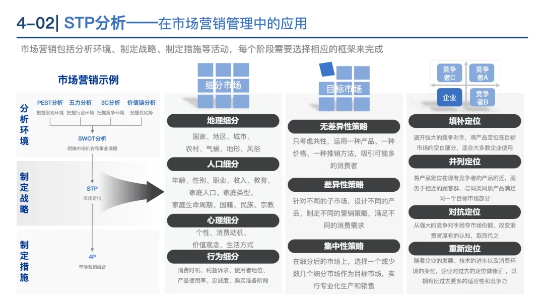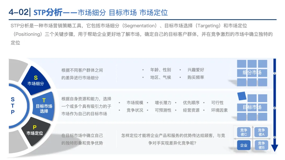 STP分析:市场细分(按年龄、行为等划分)→目标市场选择(评估吸引力)→市场定位(差异化竞争)。