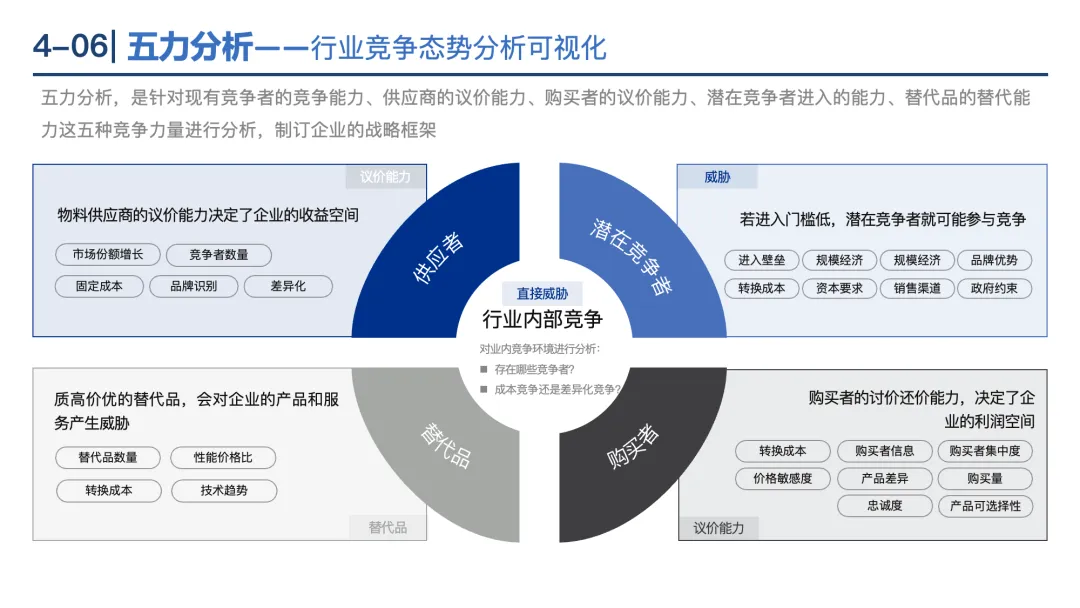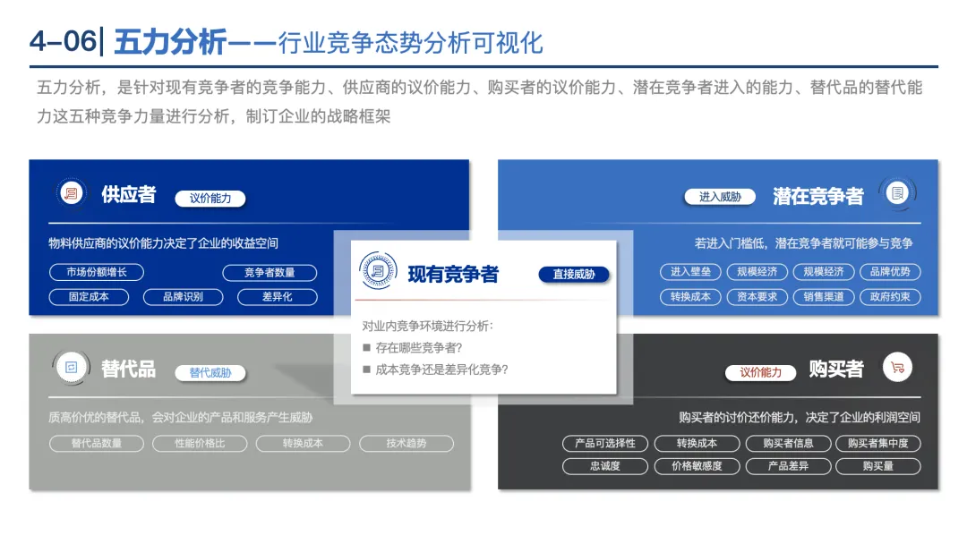 五力分析:分析现有竞争者、供应商议价力、购买者议价力、潜在进入者、替代品5种力量,判断行业竞争态势。