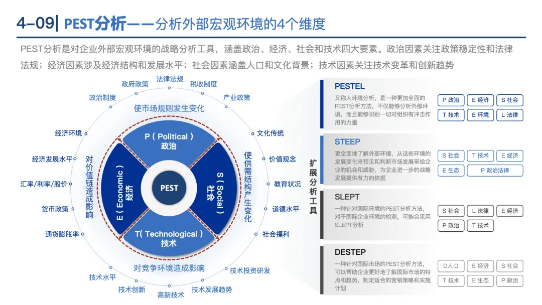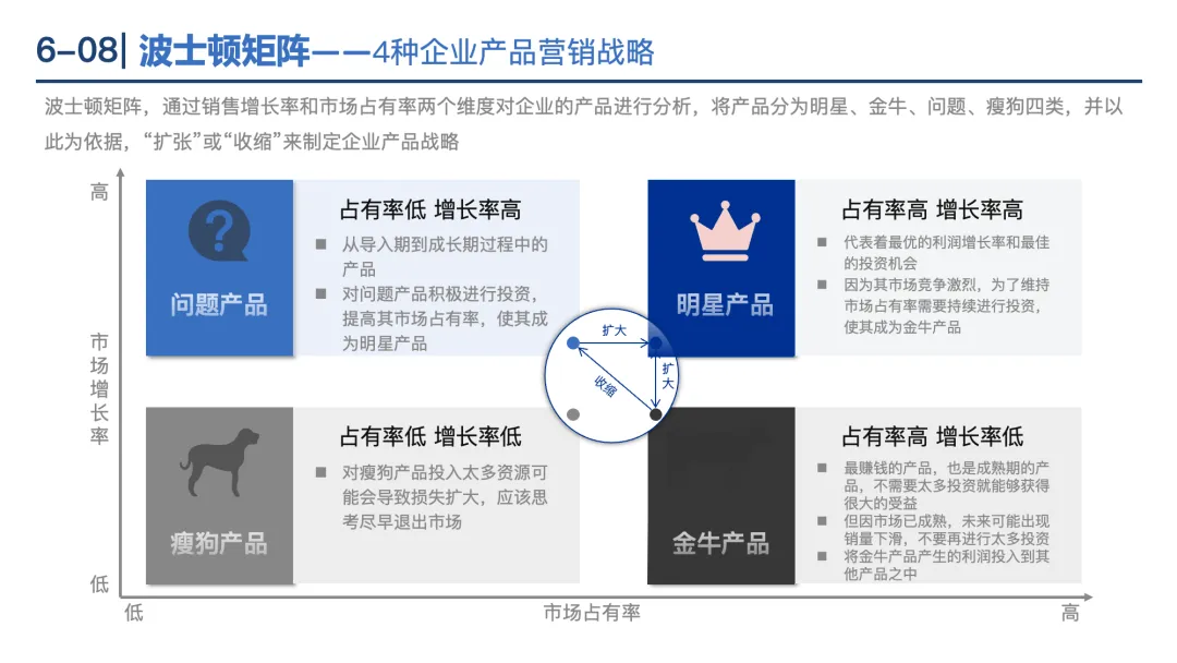 波士顿矩阵:按“市场增长率”和“市场占有率”将产品分为明星(高增长高份额)、金牛(低增长高份额)、问题(高增长低份额)、瘦狗(低增长低份额),针对性制定扩张或收缩战略。