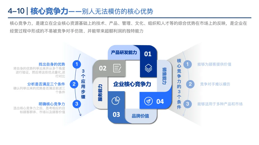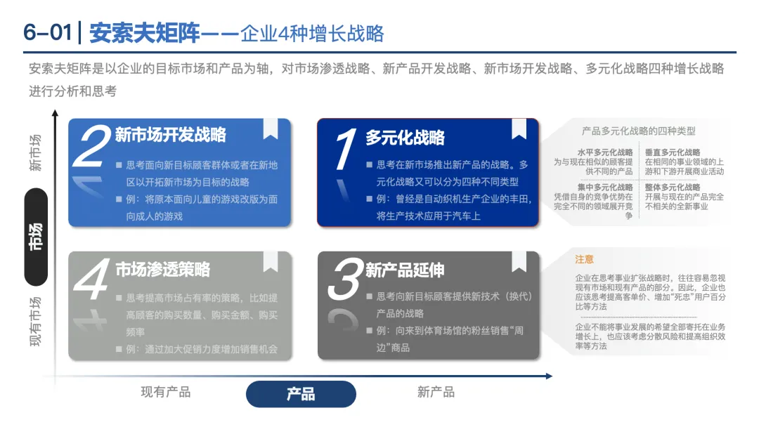 安索夫矩阵:基于“现有产品/新产品”和“现有市场/新市场”,分为市场渗透、新产品开发、新市场开发、多元化4种增长战略。