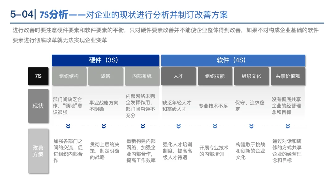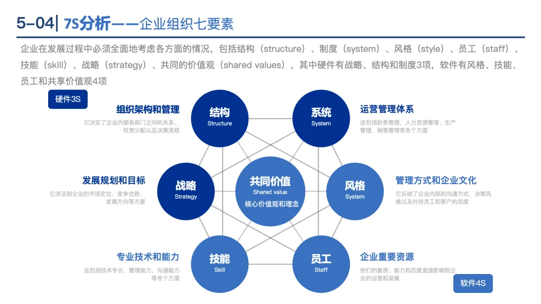 7S分析:硬件3S(战略、结构、系统)+软件4S(风格、技能、员工、共享价值观),全面评估企业现状。