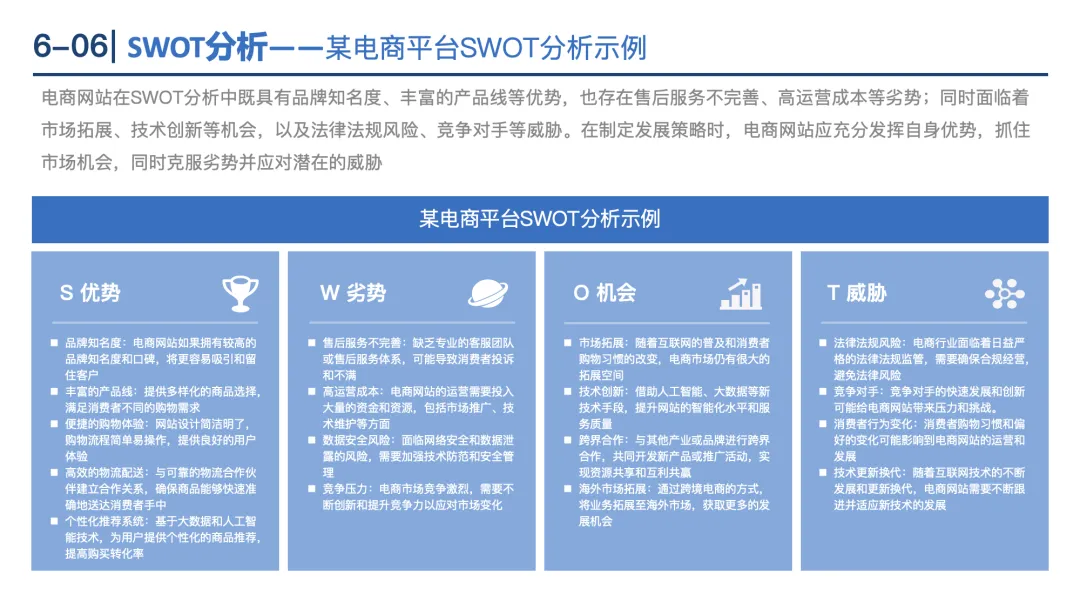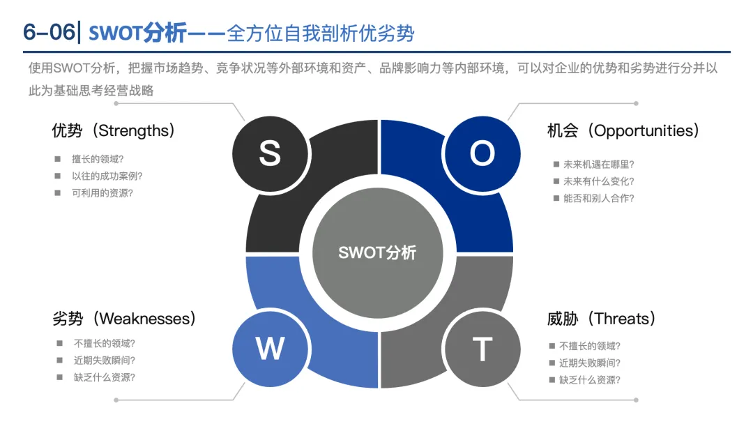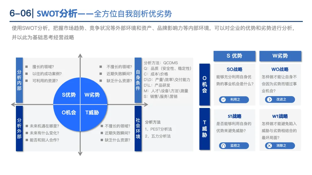 SWOT分析:整合内部优势(S)、劣势(W)和外部机会(O)、威胁(T),制定SO(用优势抓机会)、WO(补劣势抓机会)、ST(用优势避威胁)、WT(避威胁补劣势)策略。