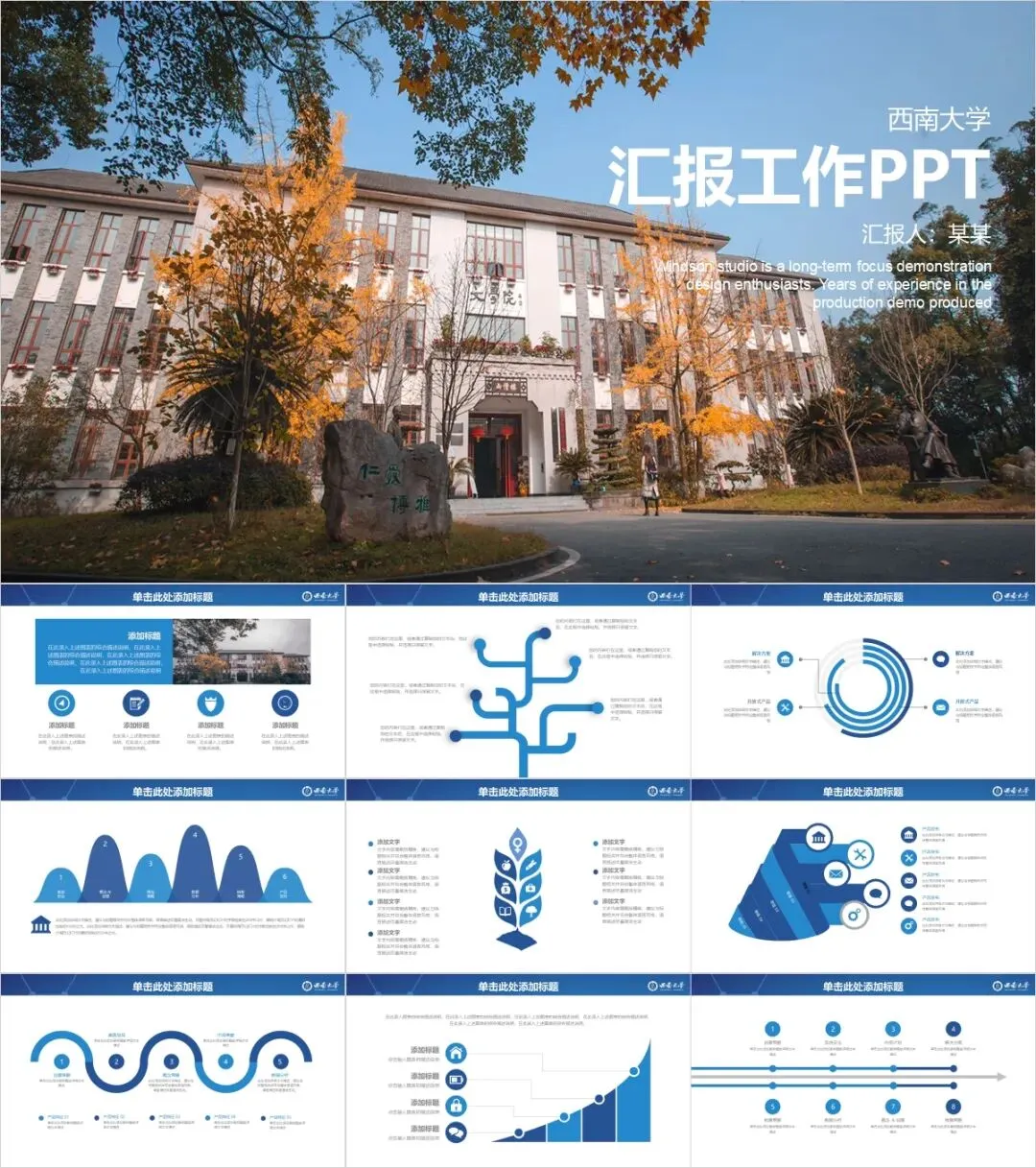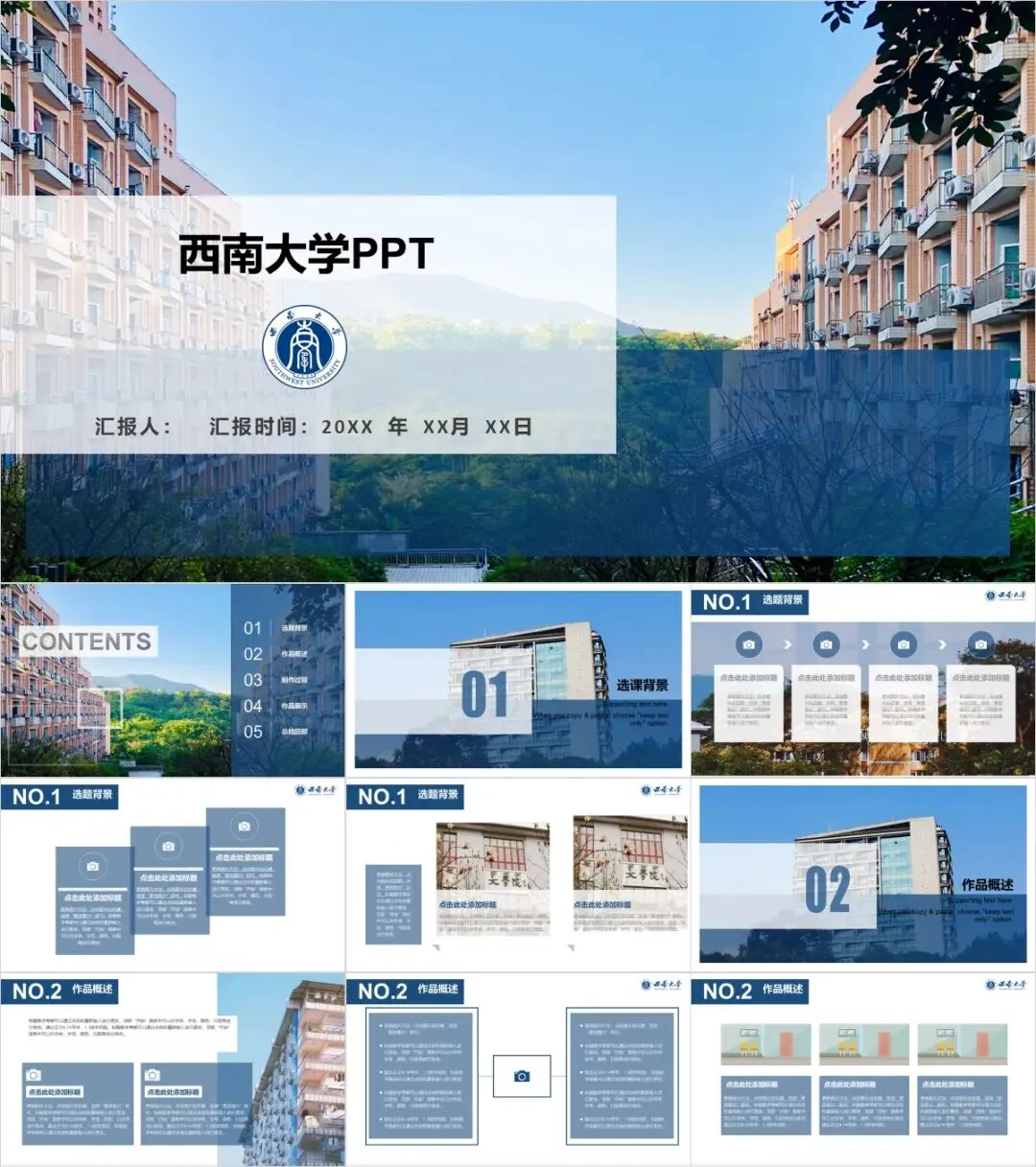 以上是我们为大家准备的西南大学专属PPT模板,文中的所有板式都是可编辑的,大家可以上传替换自己喜欢的校园美景,做出具有自己风格的专属PPT哦!其他同学也可以给我留言