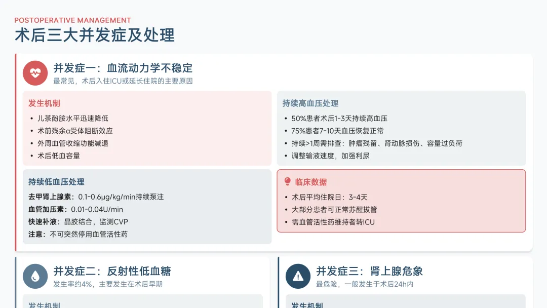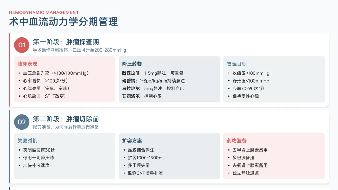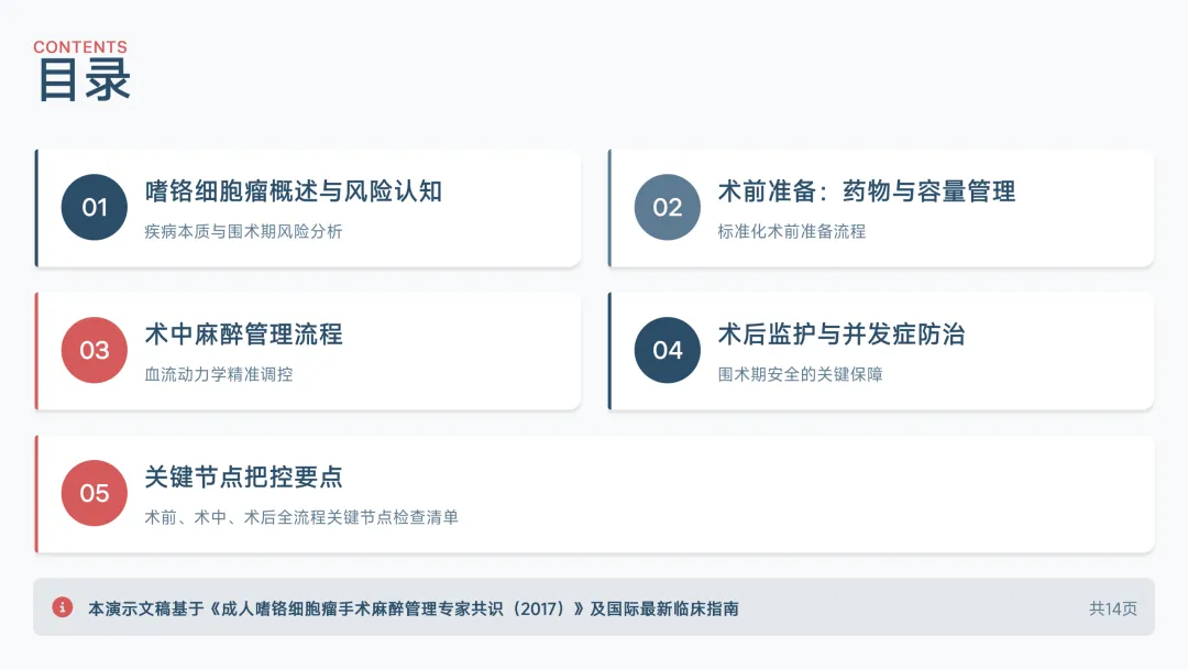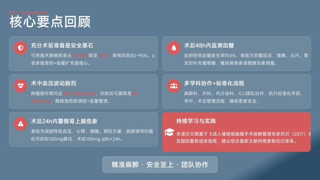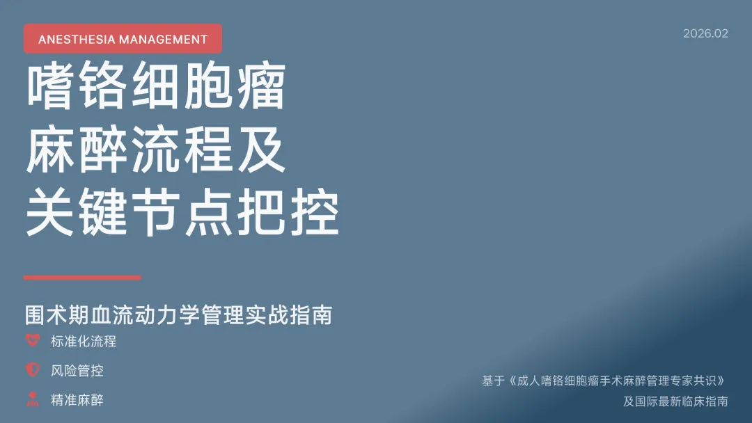 同时,强调个体化麻醉方案的重要性,针对肿瘤位置、患者心肺功能及并发症风险等因素,制定动态调整策略,以实现血流动力学的稳定维持和术后快速康复。本PPT不仅为专业读者构建完整的知识框架,更致力于推动嗜铬细胞瘤麻醉管理的规范化与精细化发展。