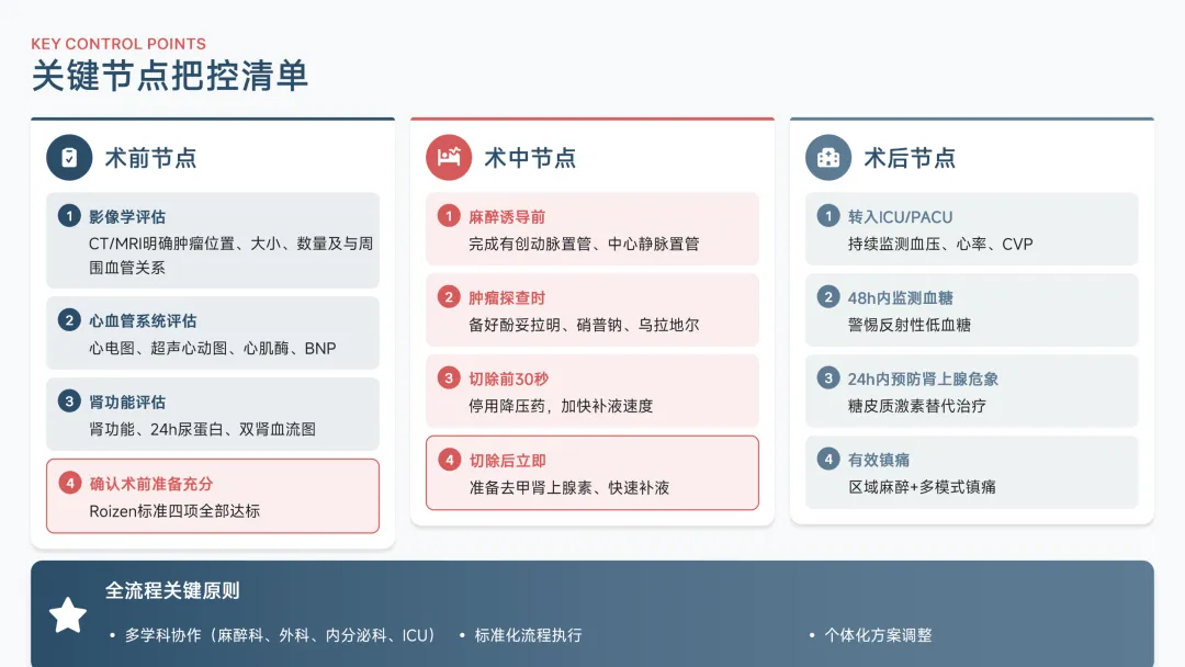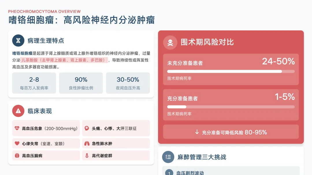 嗜铬细胞瘤作为起源于肾上腺髓质或交感神经节的特殊肿瘤,其临床特征在于持续或间断释放大量儿茶酚胺,导致患者出现阵发性高血压、心悸、多汗等典型症状。这类肿瘤的手术麻醉管理极具挑战性,术中因肿瘤挤压或剥离操作易诱发儿茶酚胺急性释放,引发血压剧烈波动,甚至导致高血压危象、心力衰竭或脑出血等致命并发症。因此,麻醉流程的科学设计与关键节点的精准把控,直接关系到患者围术期安全与手术成败。