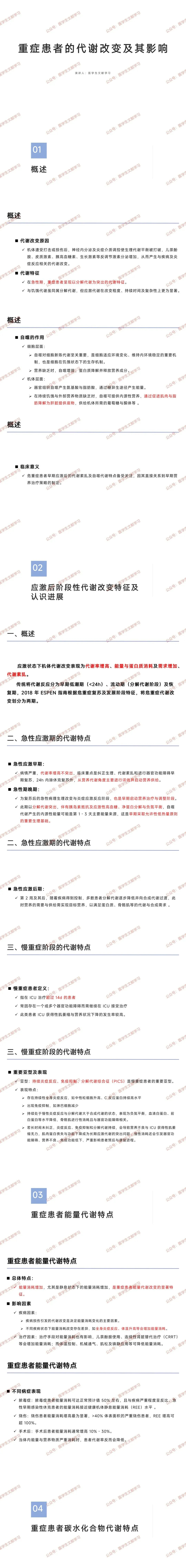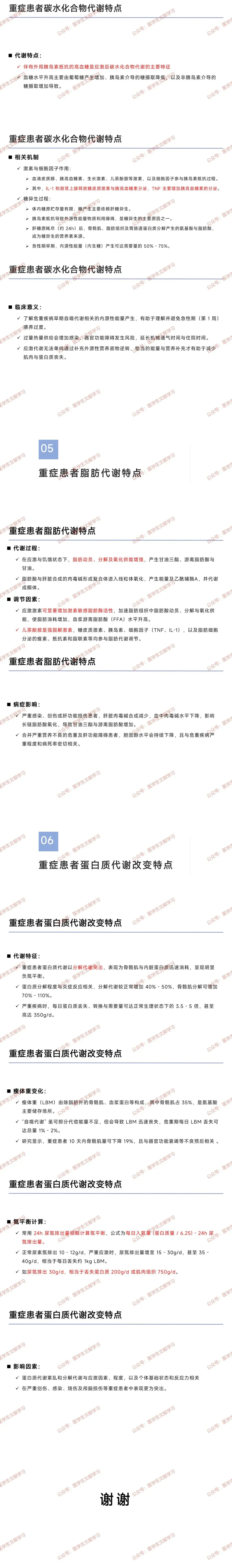 后期(第 2 周后):疾病控制后,分解代谢减弱,向合成代谢过渡,需提供 “目标营养”,满足蛋白质、骨骼肌合成需求。