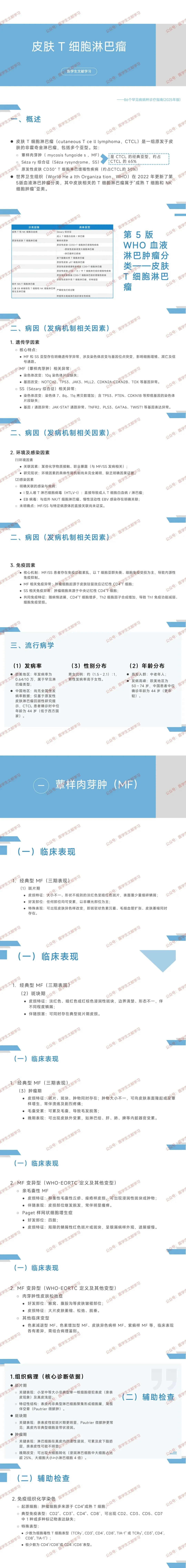 - 疾病定义:CTCL 是原发于皮肤的 T 细胞来源淋巴瘤,以局部或泛发性皮肤损害为主要表现,部分亚型可累及淋巴结及内脏器官。