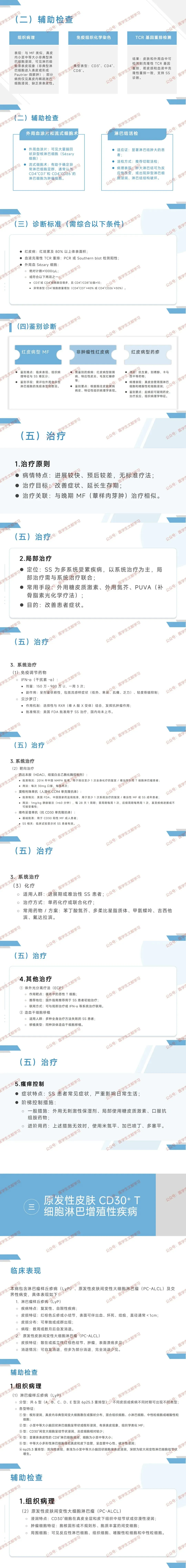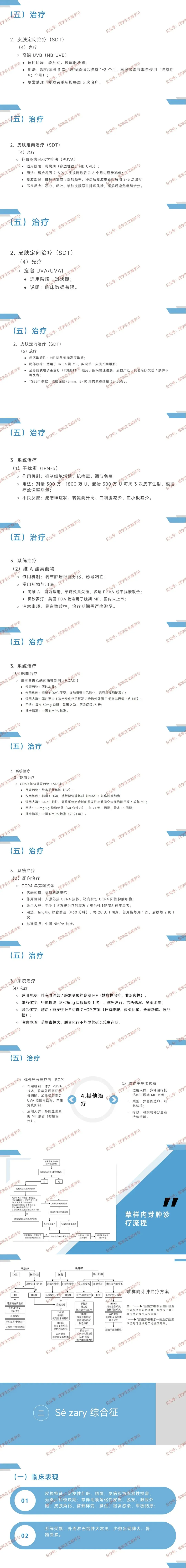 - 系统治疗:干扰素 α、靶向药(西达本胺、莫格利珠单抗、维布妥昔单抗)、化疗(苯丁酸氮芥、吉西他滨);ECP(国外推荐初始治疗)、异基因造血干细胞移植(多线失败)。