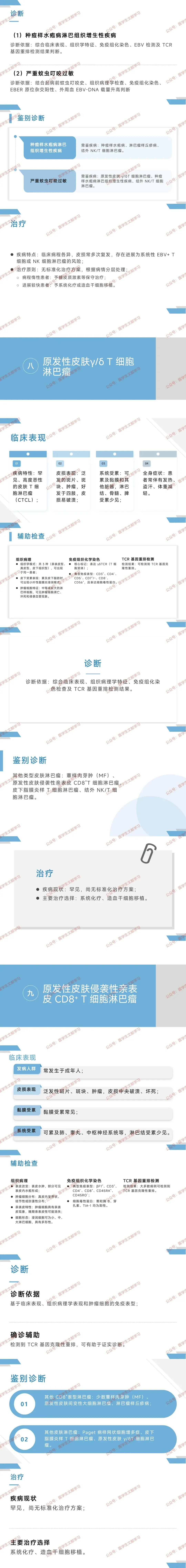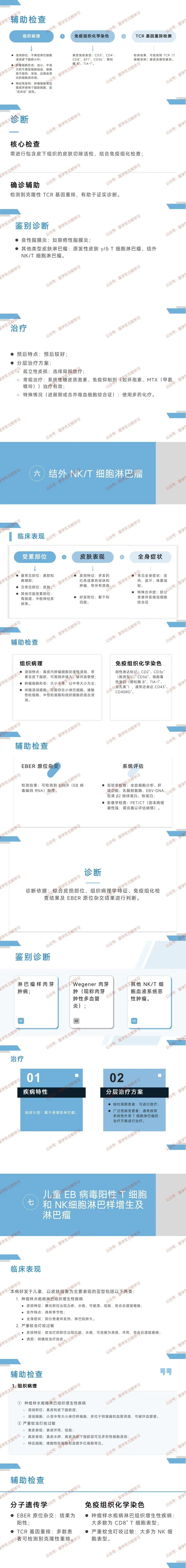 - 含种痘样水疱病淋巴组织增生性疾病(曝光部位水疱 + 瘢痕,季节性发作)、严重蚊虫叮咬过敏(叮咬部位坏死 + 瘢痕);EBER+,治疗依病情分层,惰性者激素,进展者化疗 / 移植。