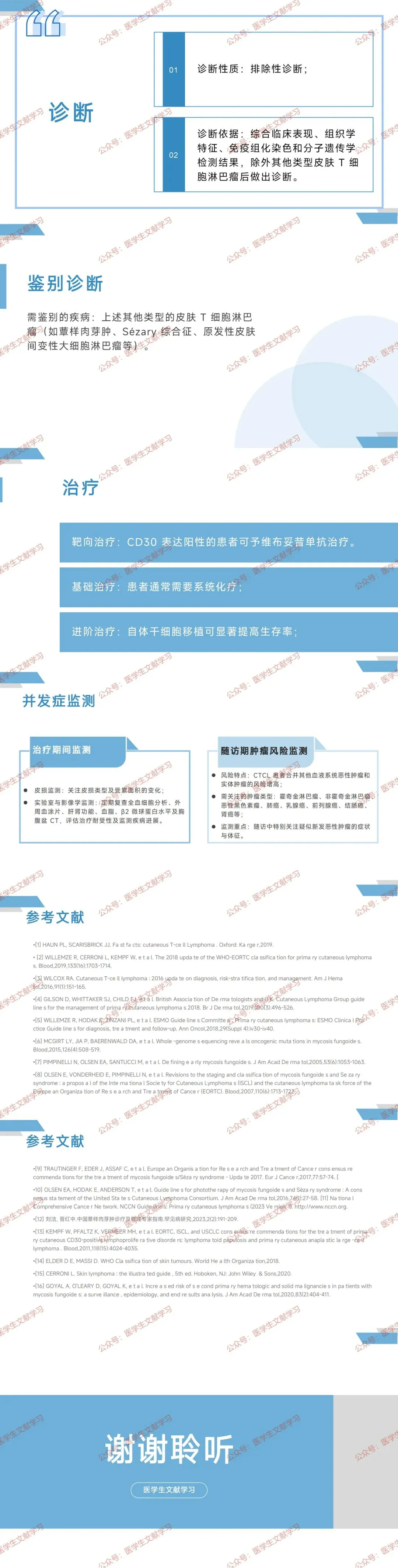 - 随访期肿瘤风险:CTCL 患者合并其他血液 / 实体瘤风险升高(如霍奇金淋巴瘤、肺癌、乳腺癌),随访需关注新发肿瘤症状与体征。