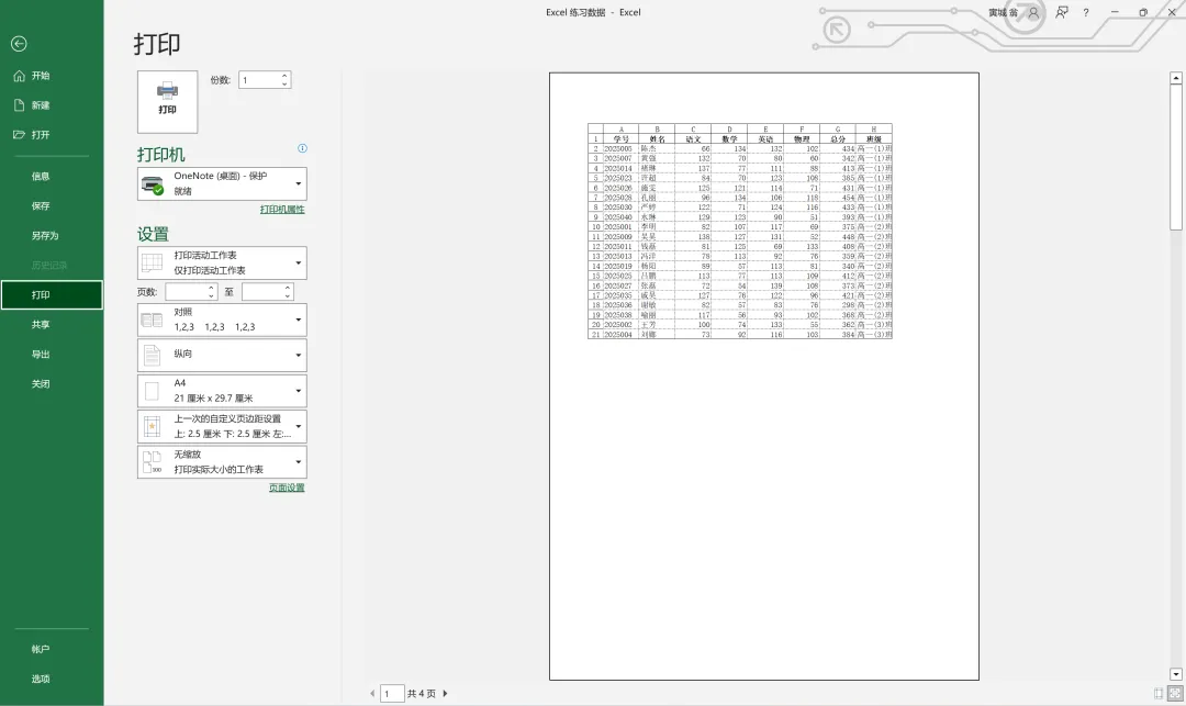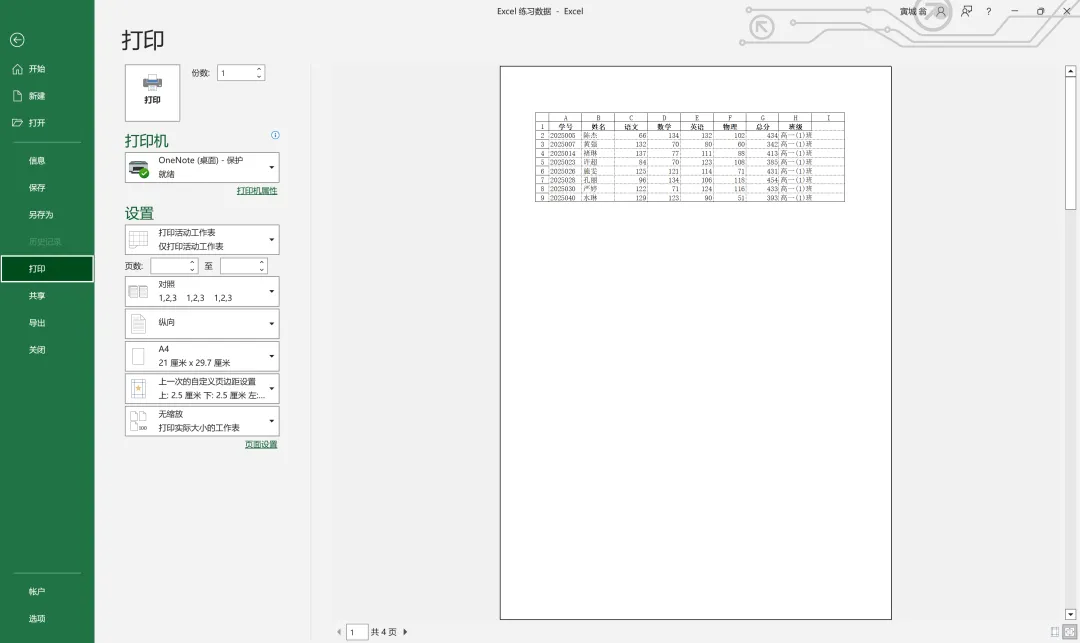 此时,我们将在打印预览中看见被分好的四页表格