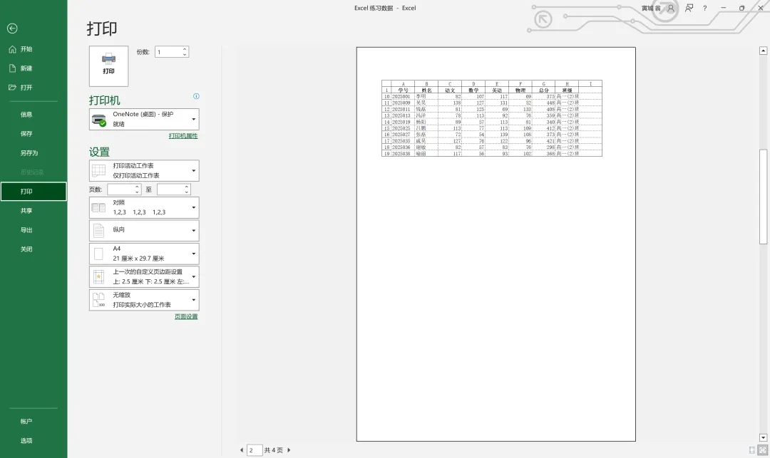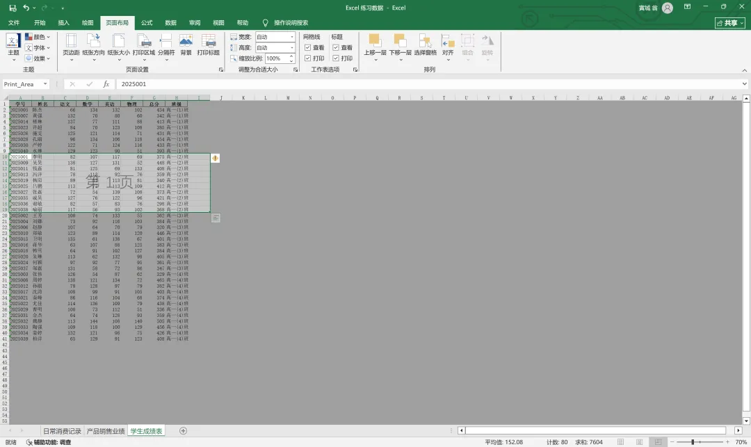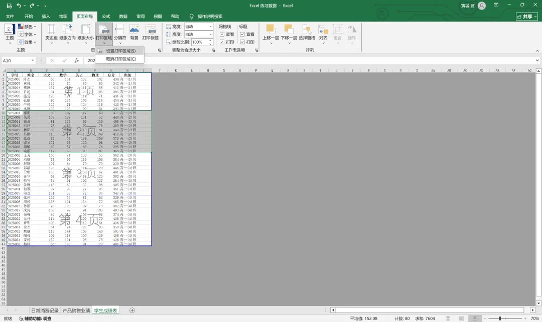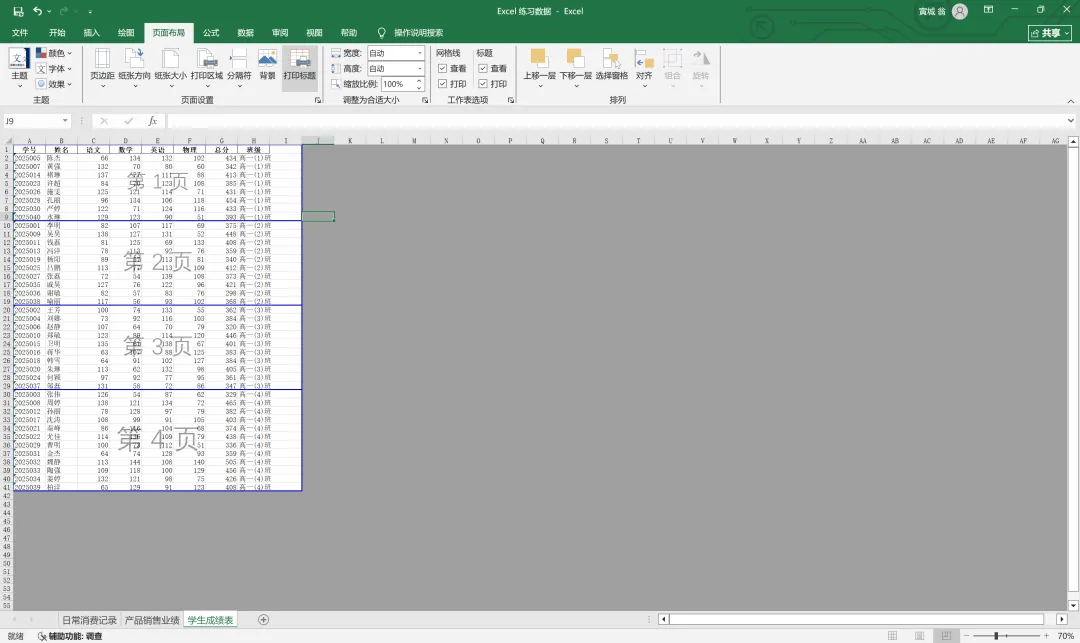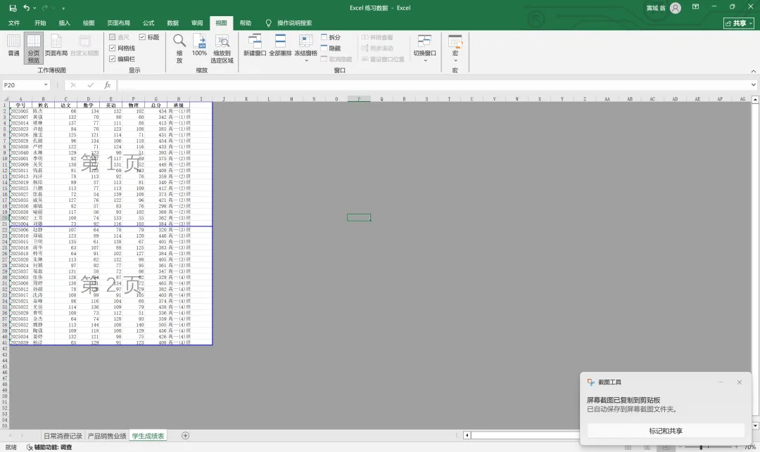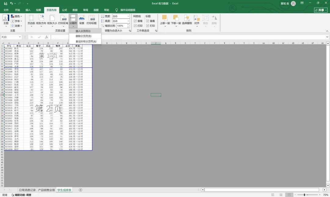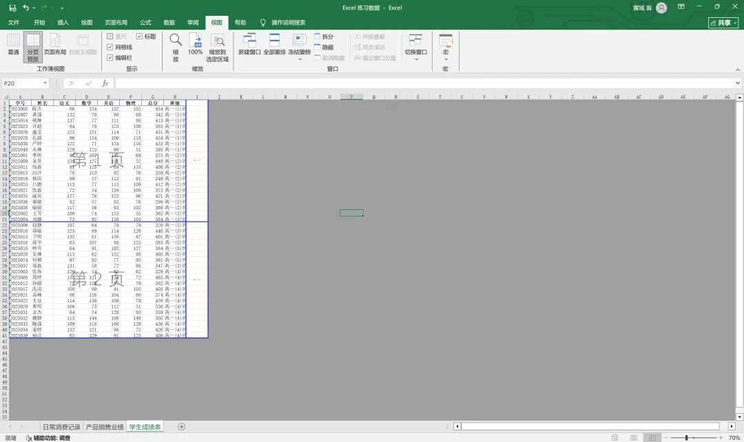 此时我想把表格中的四个班级的成绩分入不同页面,则将中间的蓝线向上移动至1班和2班分界处。