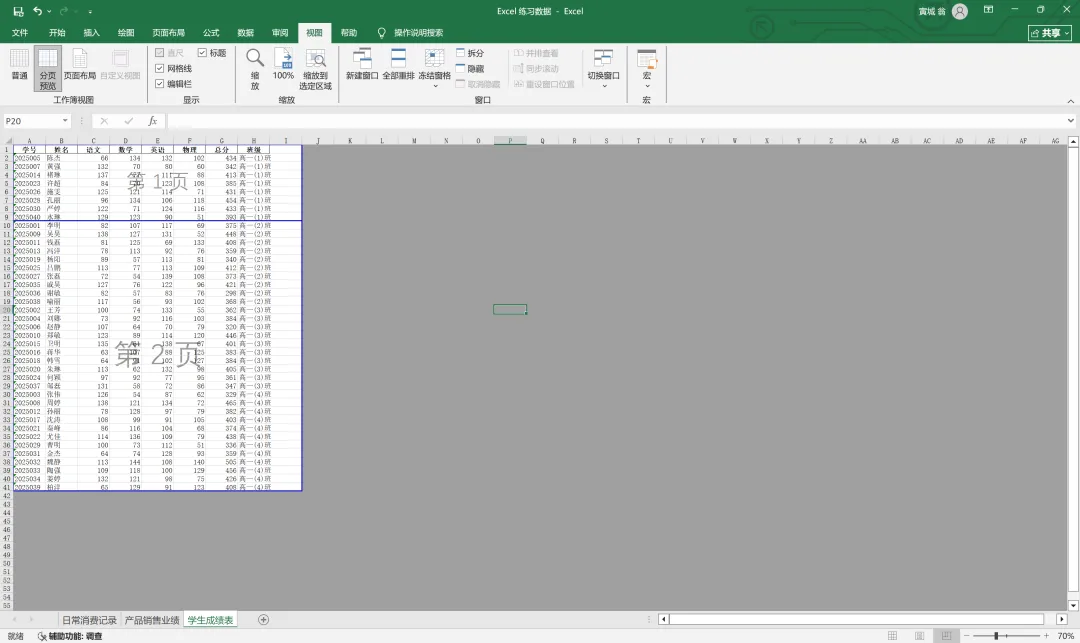 我们点击视图栏,把工作簿视图从普通改为分页预览,即可产生如下效果