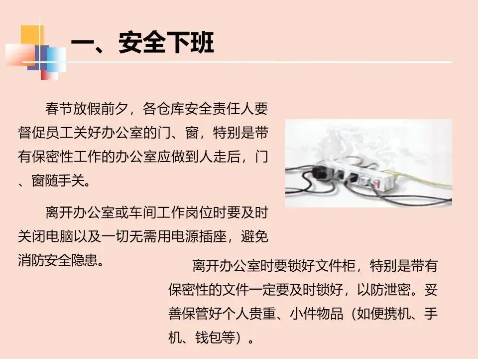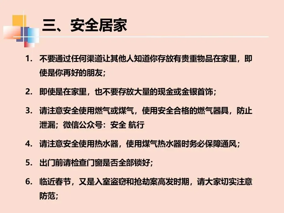为护航万家团圆,助力企业及个人平安迎新年,“安全航行”特别整理汇总了一份《节前培训节后复工课件系列【第3套】春节节前节后课件》,从网络精心搜集并分类整合了72个实用、即用的安全教育培训课件,涵盖节前隐患排查、出行安全、居家消防、应急处理、复工复产等重点场景,助你系统筑牢节日安全防线。