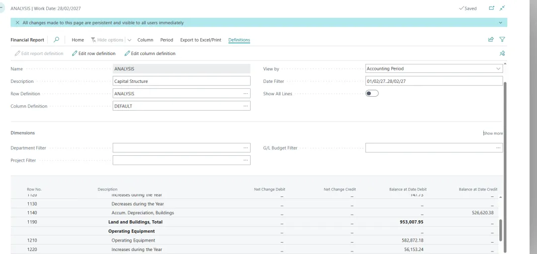 你可以将财务报表与Excel工作簿模板集成,调整布局以满足需求,然后用Business Central的数据更新Excel模板。例如,这种集成让你更容易以适合自己的格式生成每月和年度财务报表。