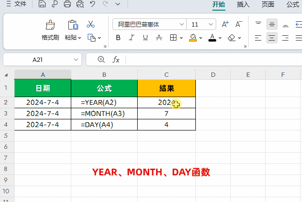功能:YEAR、MONTH、DAY函数分别用于获取日期的年份、月份、天。