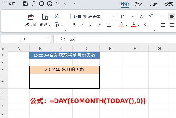 如下图所示,我们通过函数公式获取当前时间的年份和月份,然后通过公式自动获取当前月份天数。