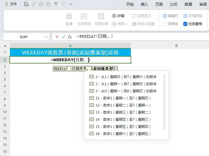 语法:=WEEKDAY(日期,[返回值类型])