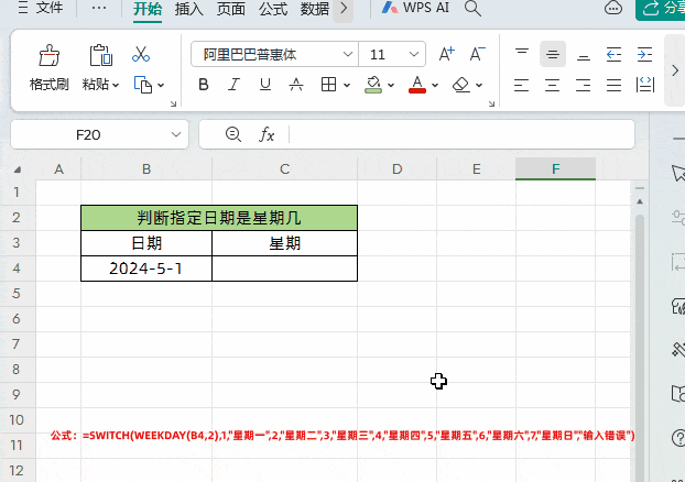 =SWITCH(WEEKDAY(B4,2),1,"星期一",2,"星期二",3,"星期三",4,"星期四",5,"星期五",6,"星期六",7,"星期日","输入错误")