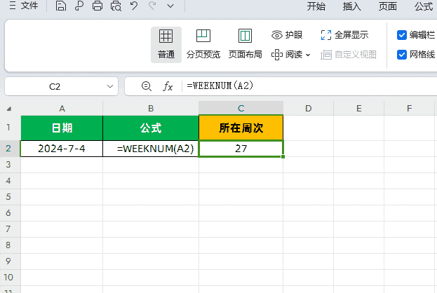 公式:=WEEKNUM(A2)