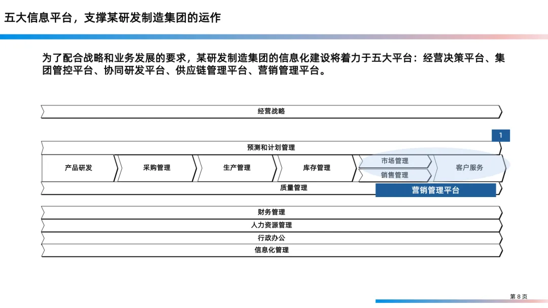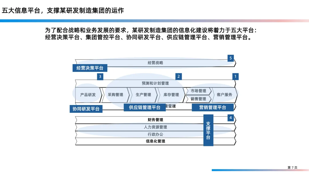 方案核心目标是构建五大信息平台。平台覆盖经营决策、供应链管理、营销管理、协同研发四大业务领域。打通从市场到生产的全流程。实现业务数据实时共享。提升跨部门协同效率。支撑集团战略目标的实现。