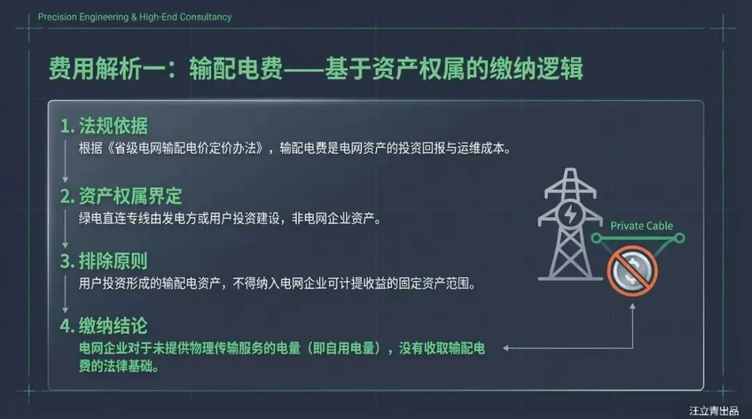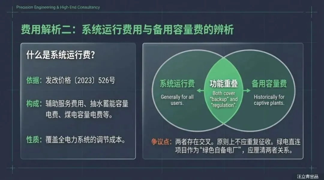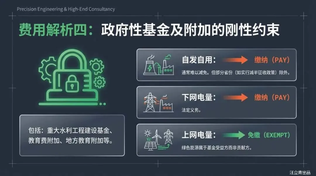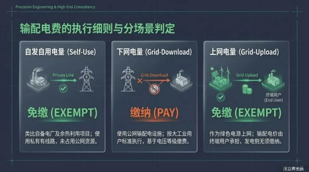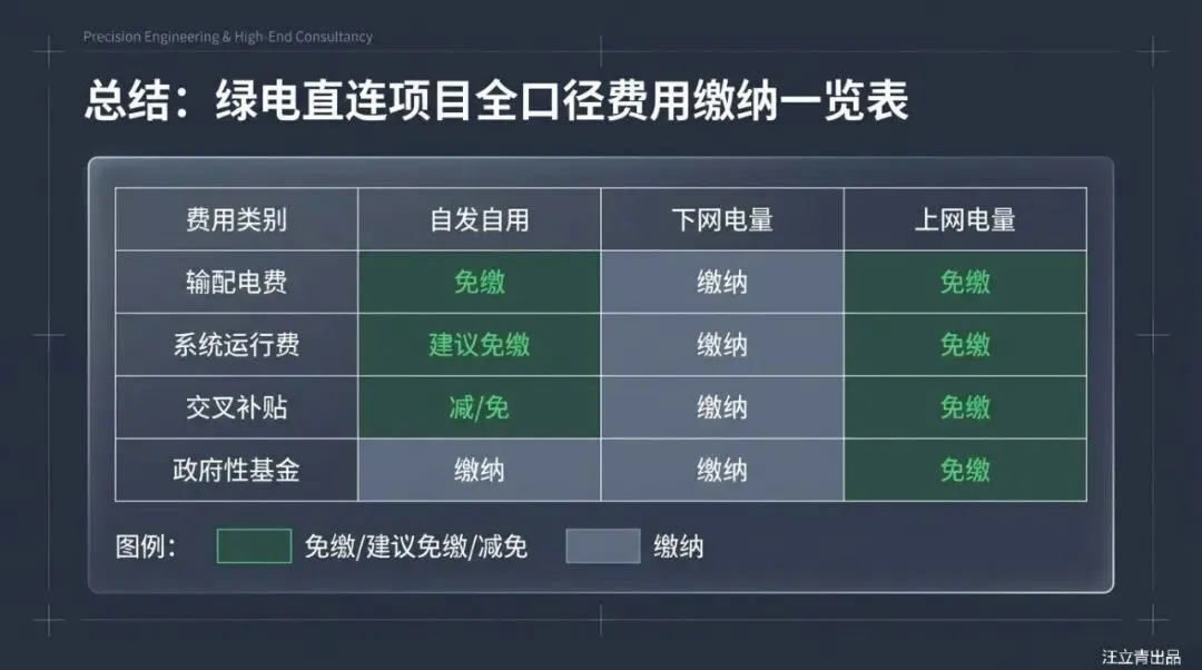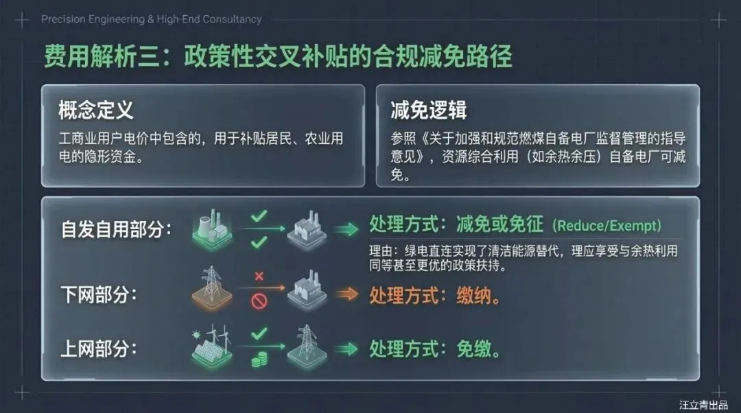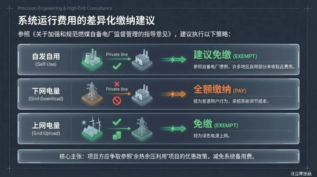 报告中最具价值的发现是明确了“输配电费”的免除逻辑。对于项目中最核心的“自发自用”电量,报告指出,由于直连专线是由电源或负荷主体自行投资,而非电网资产,因此电网企业失去了收取输配电费的法律基础。这相当于企业自建了一条“高速公路”,自然无需向电网缴纳“过路费”。仅此一项,就能为企业节省下巨大的度电成本。同时,对于令投资者头疼的“系统运行费用”和“政策性交叉补贴”,报告提出了极具操作性的“减免方案”:参照余热余压等自备电厂的优惠政策,绿电直连项目理应享受同等甚至更优的减免待遇,仅需缴纳政府性基金及附加。