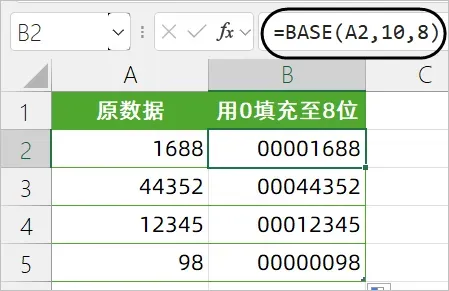 BASE的作用是将数字转换为具备给定进制的文本。第二参数是进制,第三参数是字符长度。