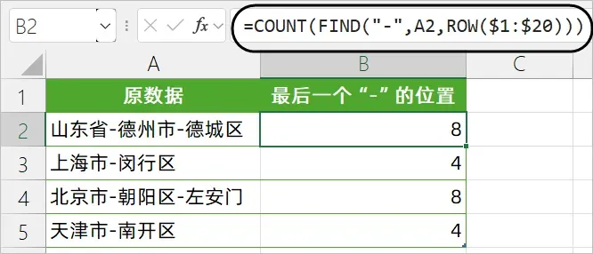 用COUNT函数统计FIND函数返回的数值个数,其结果就是最后一个“-”的位置。