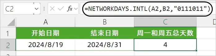 本例使用"0111011",表示将周一和周五视为工作日,来计算两个日期之间的工作日天数。