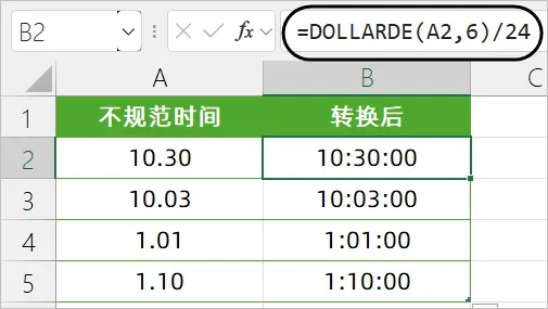 如下图所示,A列是一些不规范的时间数据,10.30对应的时间为10:30。1.01对应的时间为1:01,希望用公式转换为真正的时间数据。