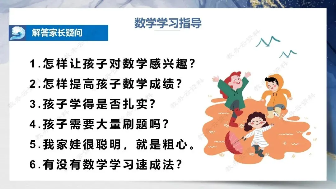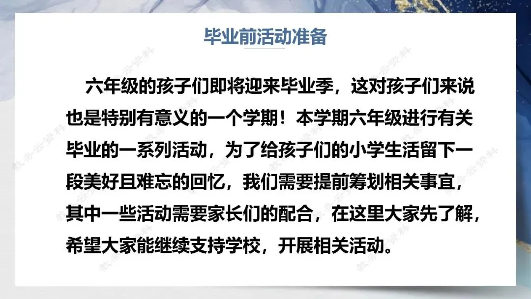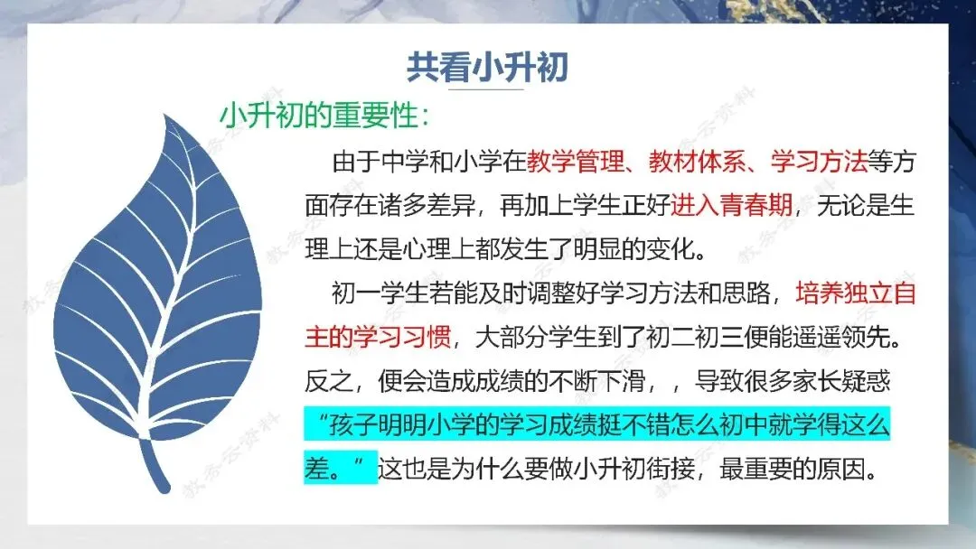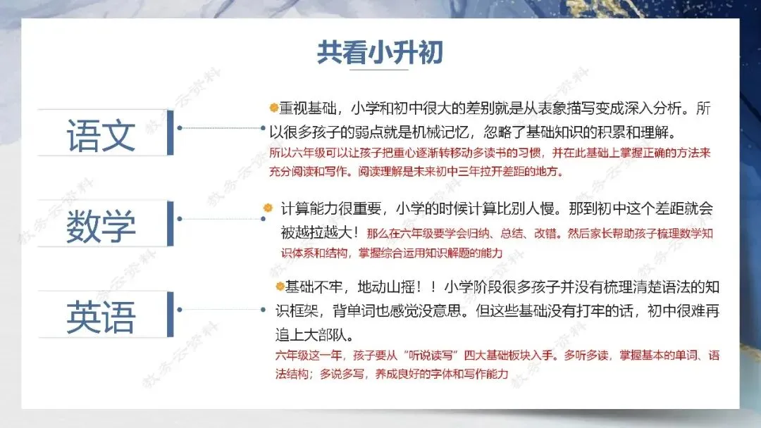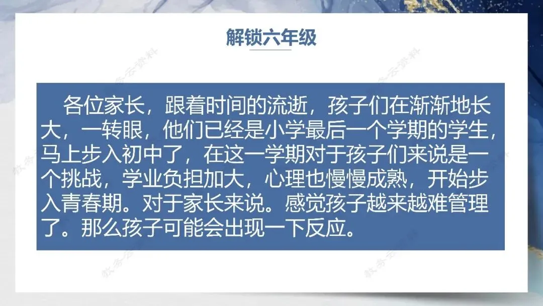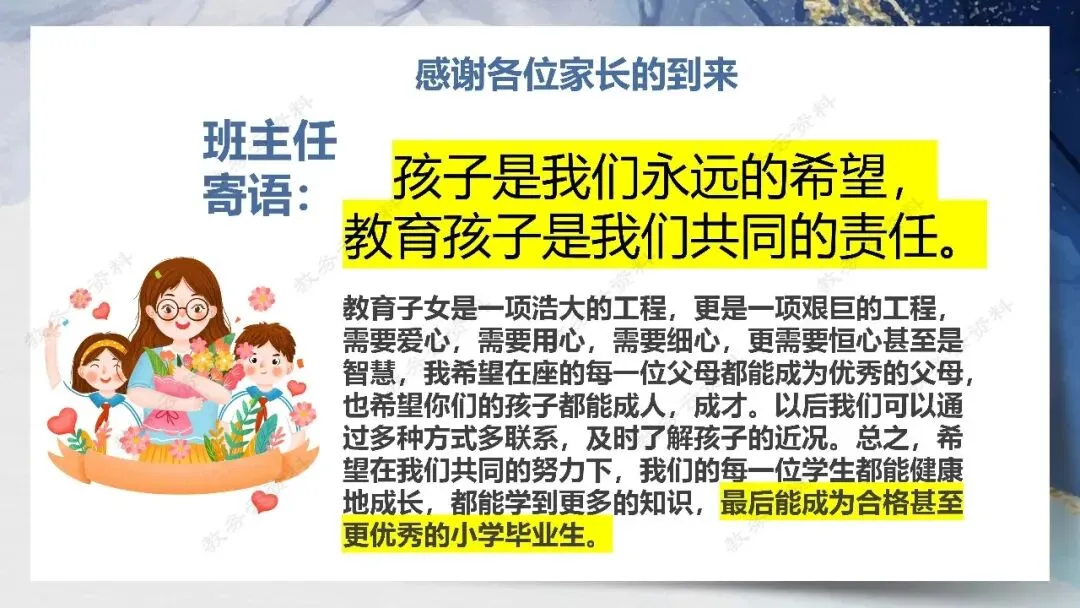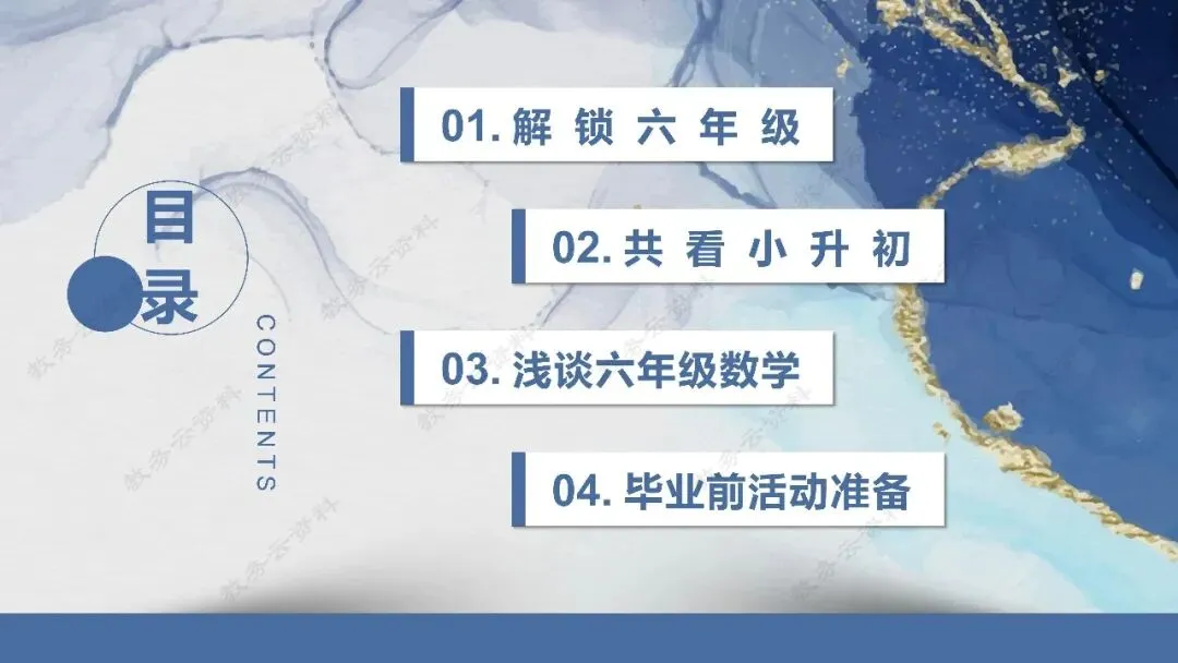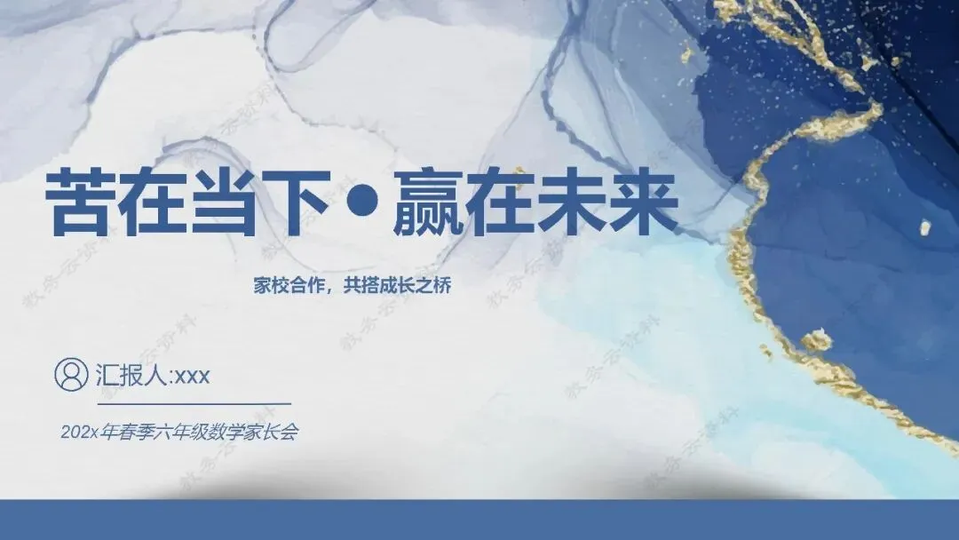 很高兴在这与您相遇,如果您是一位班主任老师,每天除了应对繁重的教学工作,还要加班整理班级、教务、教研、课件PPT资料,请关注下方的“教务云资料”,让我们风雨同路、一起成长!今天分享的是(小升初)六年级春季学期数学开学家长会ppt课件,主题是《苦在当下,赢在未来》。课件PPT一共64页,配套班主任兼数学老师发言稿。(文末有课件资料的获取方式)点击下方图片,打开小程序,付费查看,可自助下载资料,课件下载后无水印、可编辑、可修改!