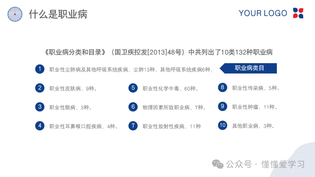 《职业病分类和目录》(国卫疾控发[2013]48号)是我国职业病防治的重要法规,它明确列出了10大类132种职业病,涵盖了从尘肺病、放射性疾病到职业性肿瘤等多种类型。每一类职业病都有其特定的诊断标准和治疗方案,为职业病的诊断、治疗和预防提供了明确的指导。例如,尘肺病是由于长期吸入粉尘导致的肺部纤维化疾病,而放射性疾病则是由电离辐射引起的全身性或局部性疾病。这些疾病的识别和防治,需要依据科学的分类和目录进行。
