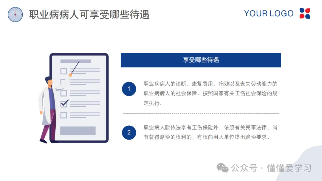 医疗救治与康复:职业病病人有权获得及时、有效的医疗救治和康复治疗。用人单位应承担职业病病人的医疗费用,并按照国家规定给予相应的医疗期和康复期。对于需要长期治疗的职业病病人,用人单位应提供必要的医疗支持和经济援助。