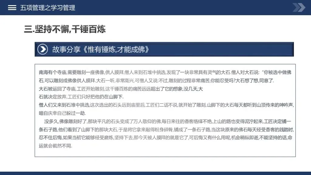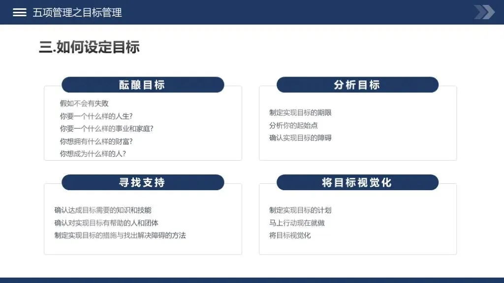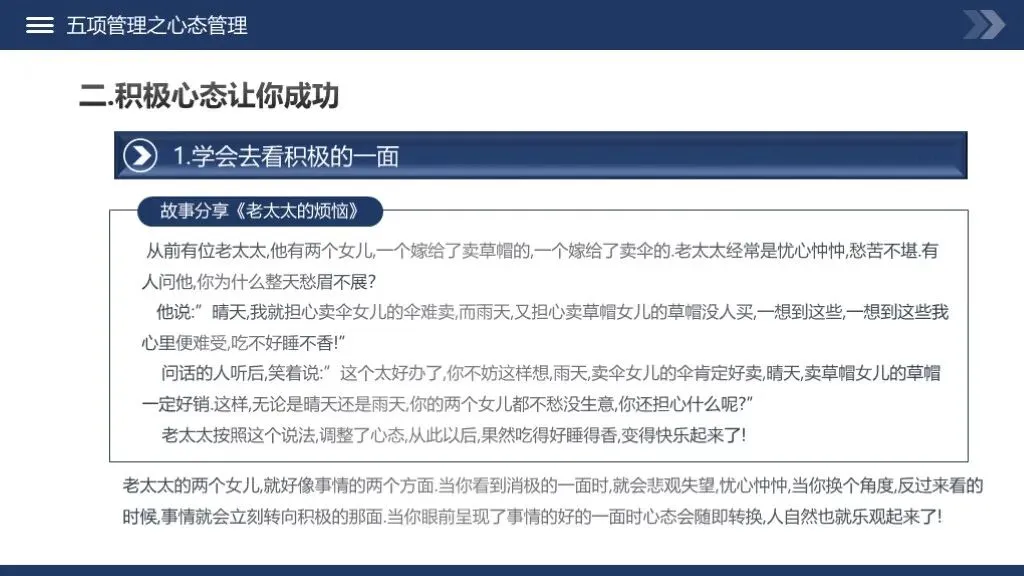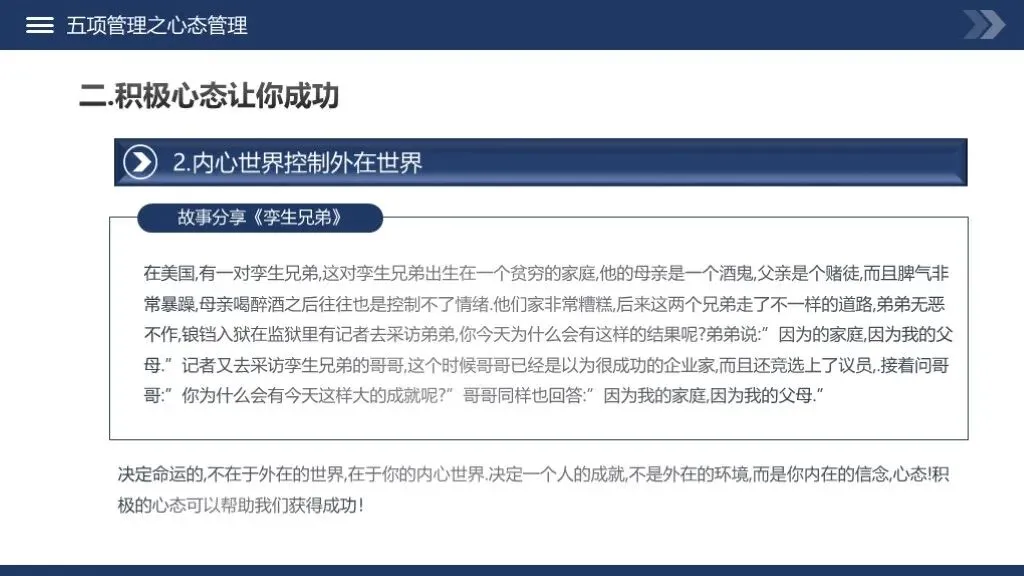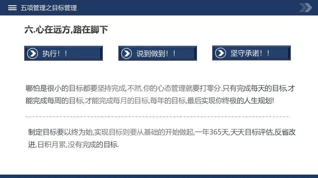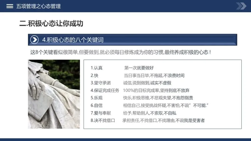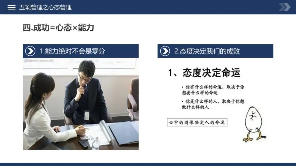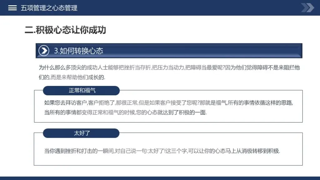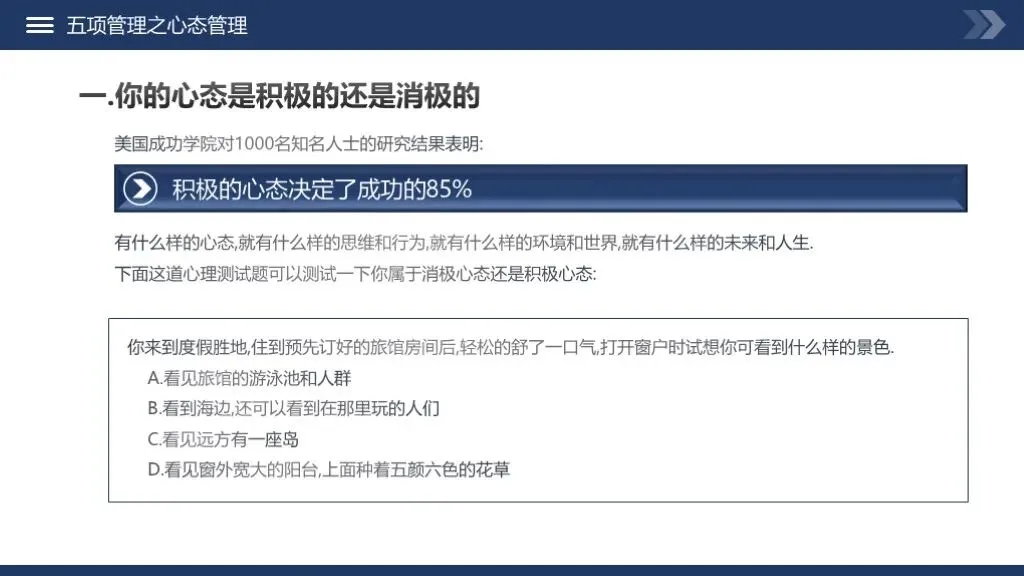 1>目标管理-管理者应该掌握的管理工具学习课件(145P PPT)2>接连不顺 情绪低落 你打算怎样度过?3>改变自己,千万不要从明天开始4>『心想事成』的本质是什么?5>职场员工应该有的六种工作心态,你做到了