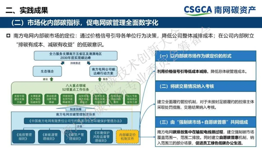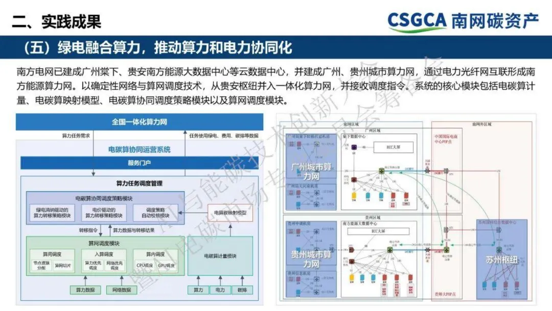 围绕“电-碳-算”协同,南方电网发挥平台优势,将碳要素融入管理各环节。在以电力算碳量方面,构建“电-能-算”数据转换关系模型,建成“电力看能耗”平台,协助掌握南方五省区能源消费数据;在内部碳市场方面,通过数据直采直送夯实基础,完成2019-2023年碳盘查并推进2024年工作;在碳足迹领域,联合产业链共建电力行业碳足迹背景数据库;在绿色金融领域,创新碳减排支持工具应用,落地多项绿色信贷项目;在算力融合方面,提出“电算协同”理念,建成能源大数据中心与城市算力网,推动绿电与算力协同化。