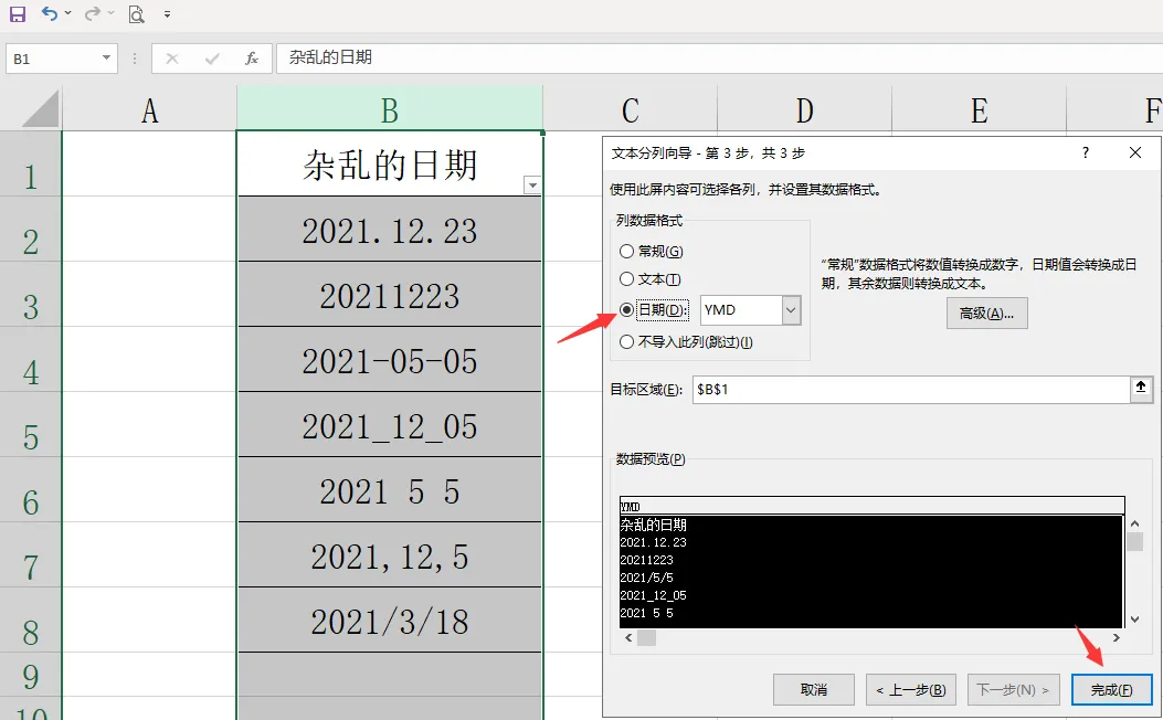 这一步至关重要,它决定了最终日期格式的统一性和规范性。完成选择后,点击“完成”按钮,奇迹发生了,原本杂乱的日期格式瞬间变得整齐划一。