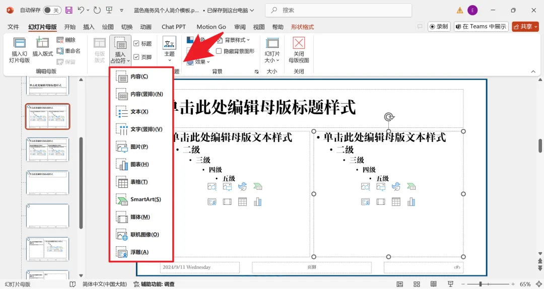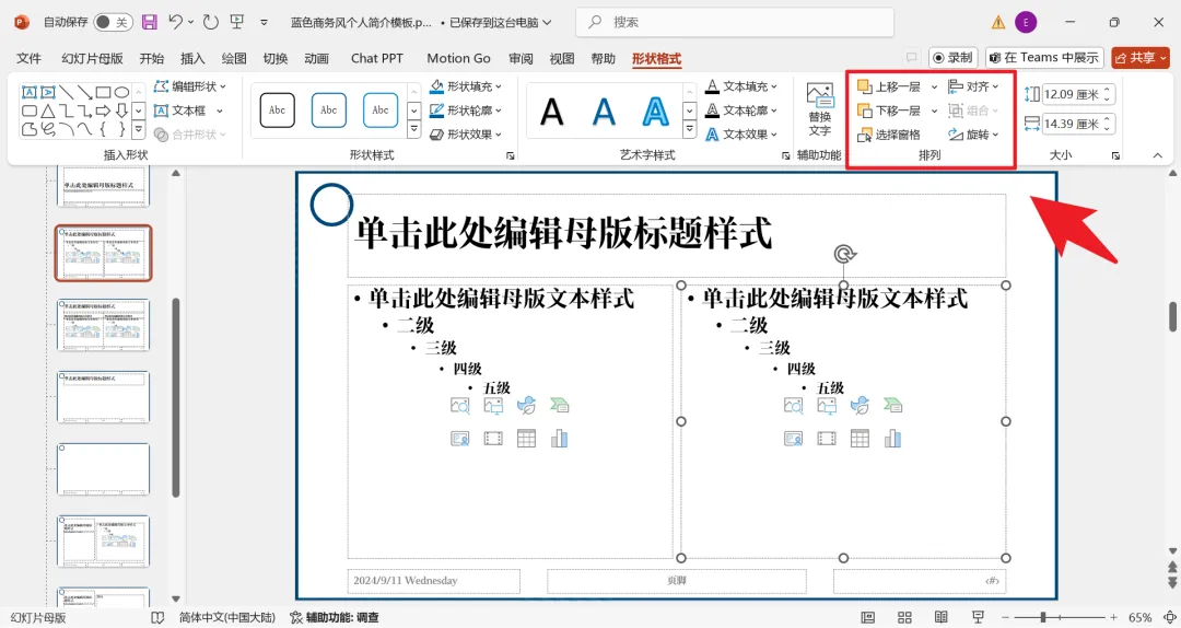 在母版视图中,可以自由编辑占位符的属性,包括大小、位置、形状等。选中占位符后,↓
