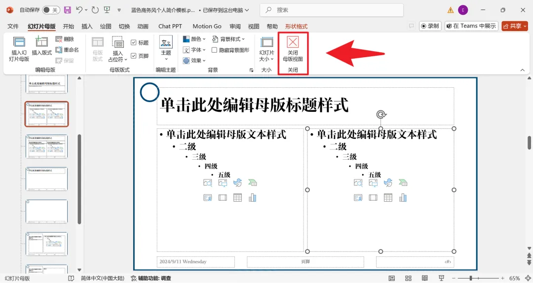 完成母版的修改后,别忘了将其应用到演示文稿中的幻灯片上。在母版视图中,点击“关闭母版视图”按钮,即可返回普通视图。