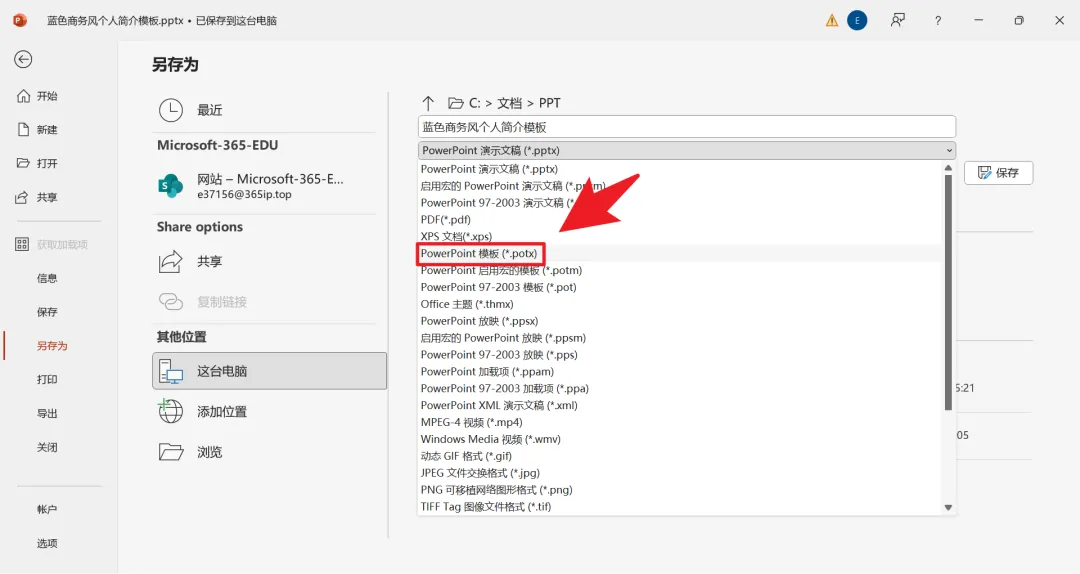 完成设计后,还可将其保存为模板文件(.potx),以便将来在其他演示文稿中重复使用。这一功能让PPT制作更加灵活多变,满足了不同场景下的需求。