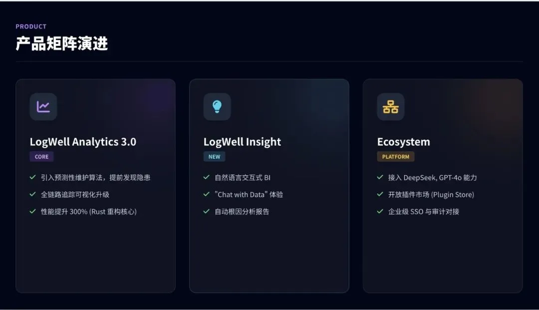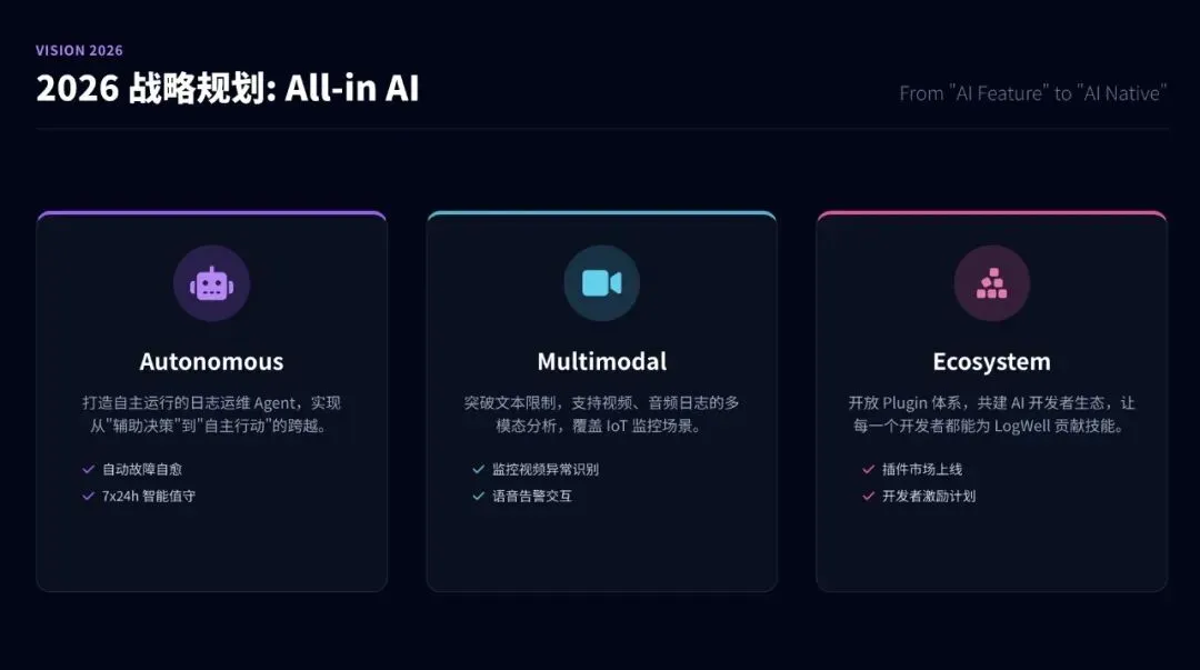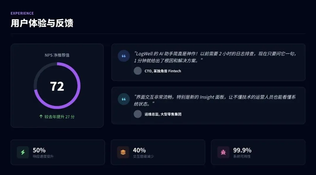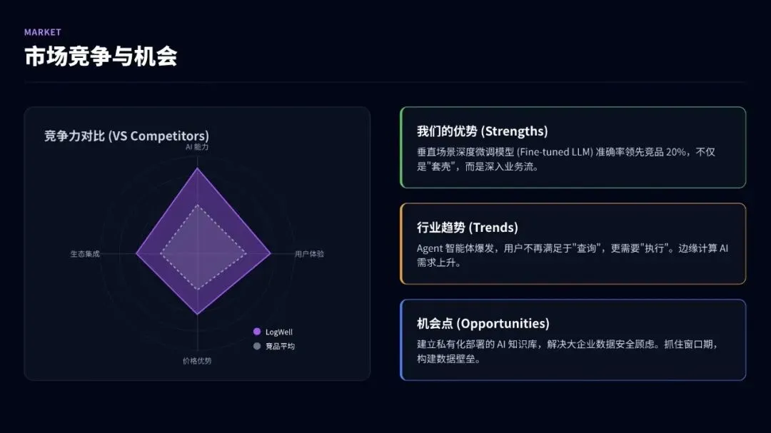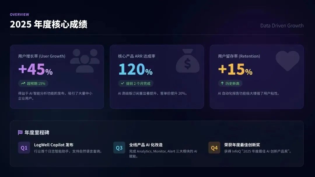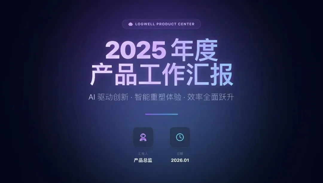 我:根据大纲,帮我生成第2页"年度核心成绩"的内容AI:好的,我为你生成了:- 用户增长率: +45% (AI功能带动)- 核心产品ARR: 达成率120%- 用户留存率: 提升15%- 发布"LogWell Copilot"智能助手- 完成全线产品AI化改造- 获得"年度最佳AI创新产品奖"