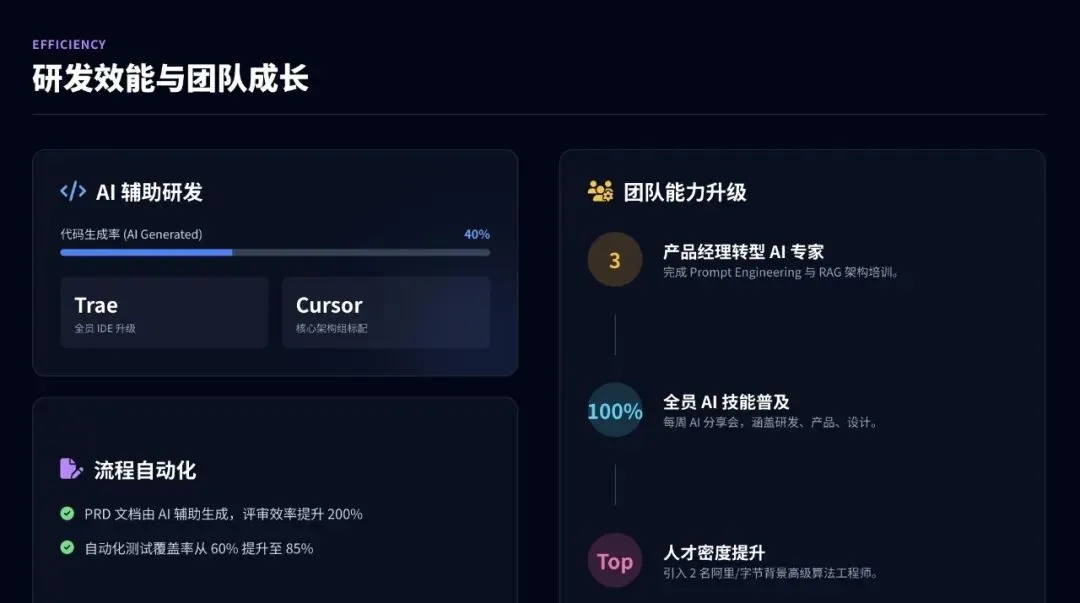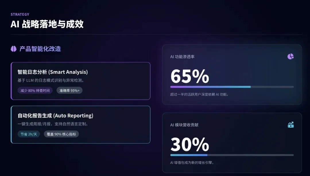 我:根据大纲,生成每一页的详细内容AI:正在生成...- 第1页:封面,科技黑+霓虹紫配色- 第2页:核心数据可视化,用户增长+45%- 第3页:AI功能渗透率65%,贡献营收30%- ...- 第10页:结束语,团队照片+愿景