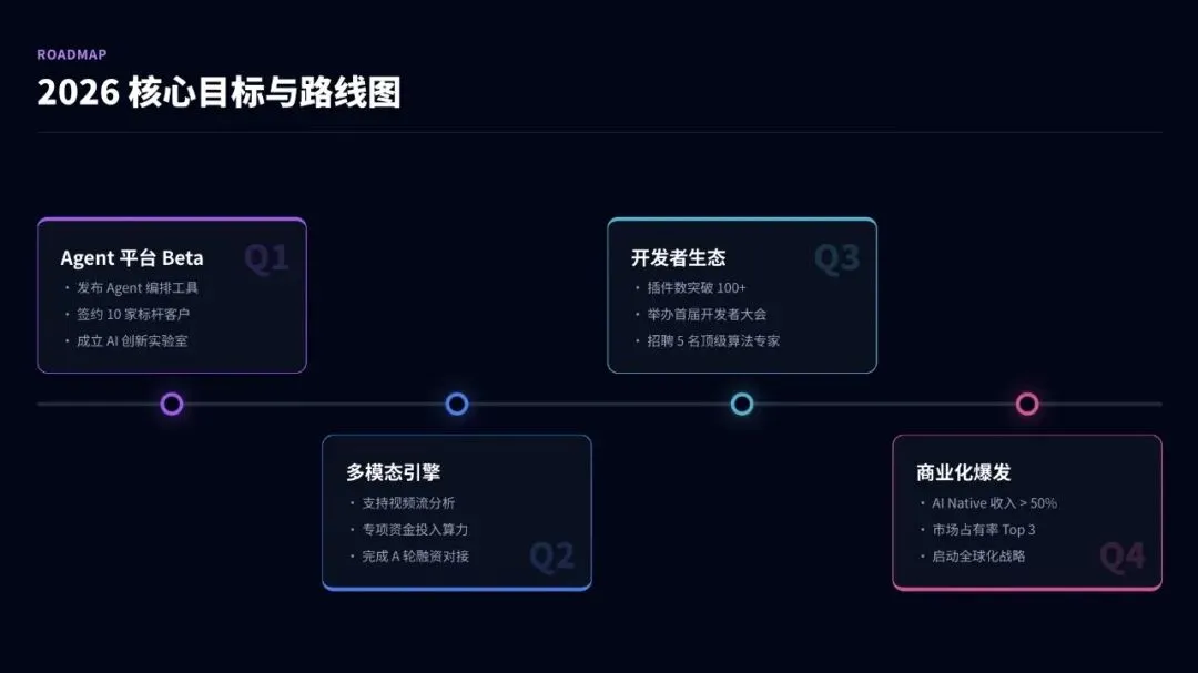 我:帮我生成一个产品总监年终汇报的大纲,主题是AI驱动创新AI:已生成10页大纲:1. 封面 - AI驱动创新·智能重塑体验2. 年度核心成绩 - 用户增长+45%3. AI战略落地与成效 - 智能化产品矩阵4. 产品矩阵演进 - 从功能到生态5. 用户体验与反馈 - NPS提升至726. 研发效能与团队 - AI辅助研发7. 市场竞争与机会 - SWOT分析8. 2026战略规划 - All-in AI9. 2026核心目标与路线图 - 季度里程碑10. 结束语 - 让每一次日志记录都充满智慧