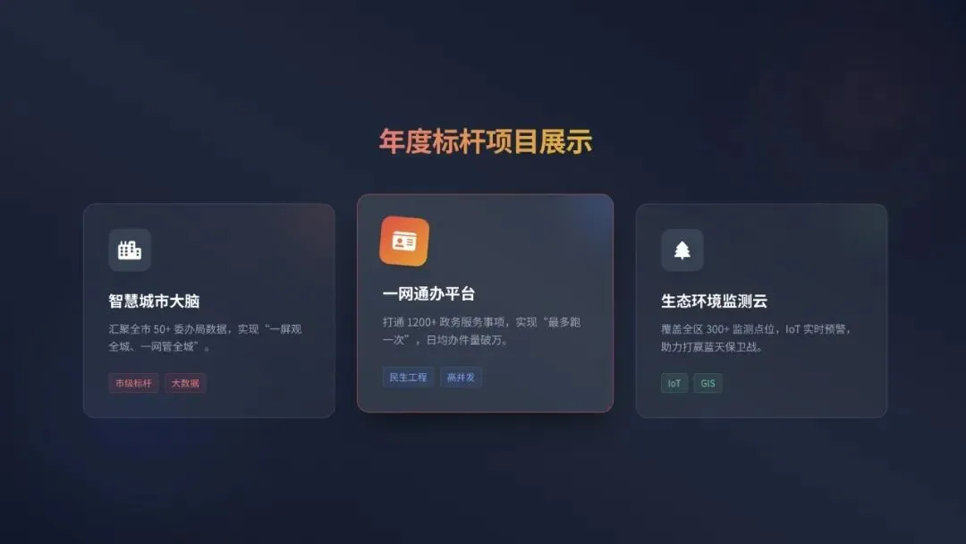 // AI生成的内容 + 预设的样式模板 = 自动渲染{"meta": {"title": "2025年度产品中心工作汇报","theme": "tech-dark","aspectRatio": "16:9" },"slides": [ {"id": "1","type": "html","content": "<div class='cover'>...</div>" } ]}