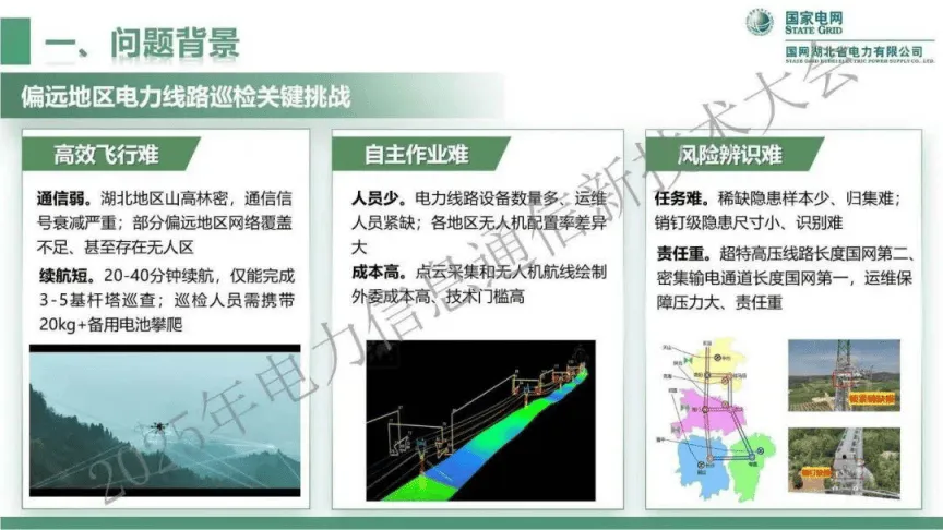 在低空经济蓬勃发展的背景下,无人机已成为电网“机器代人”的重要载体,广泛应用于精细化巡检、线路快巡、变电站巡检等多个场景。然而,偏远地区电力线路巡检面临诸多关键挑战,通信弱、续航短导致高效飞行难,人员少、成本高造成自主作业难,隐患样本稀缺、小尺寸缺陷识别难使得风险辨识难,给电网运维保障带来巨大压力。