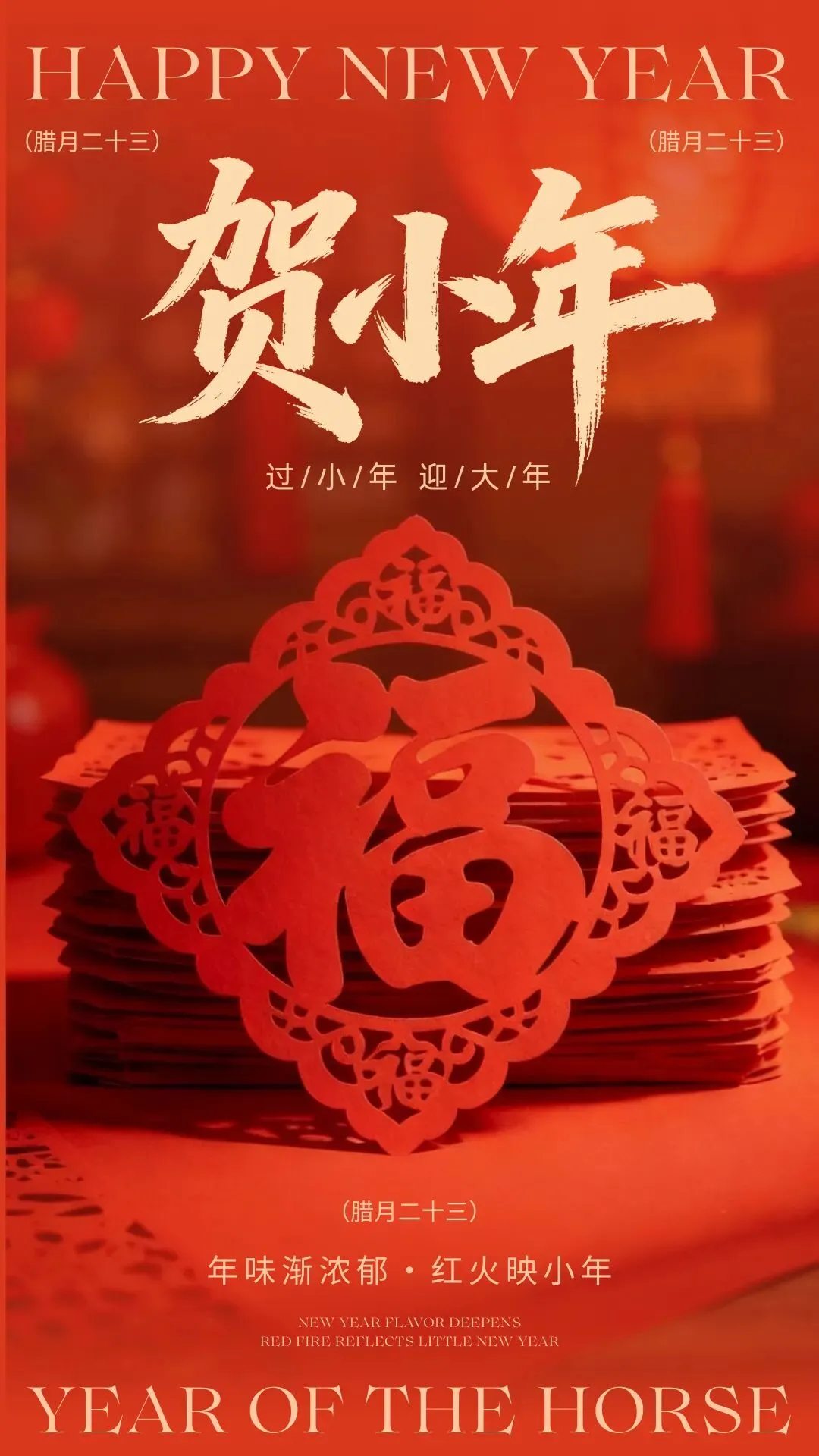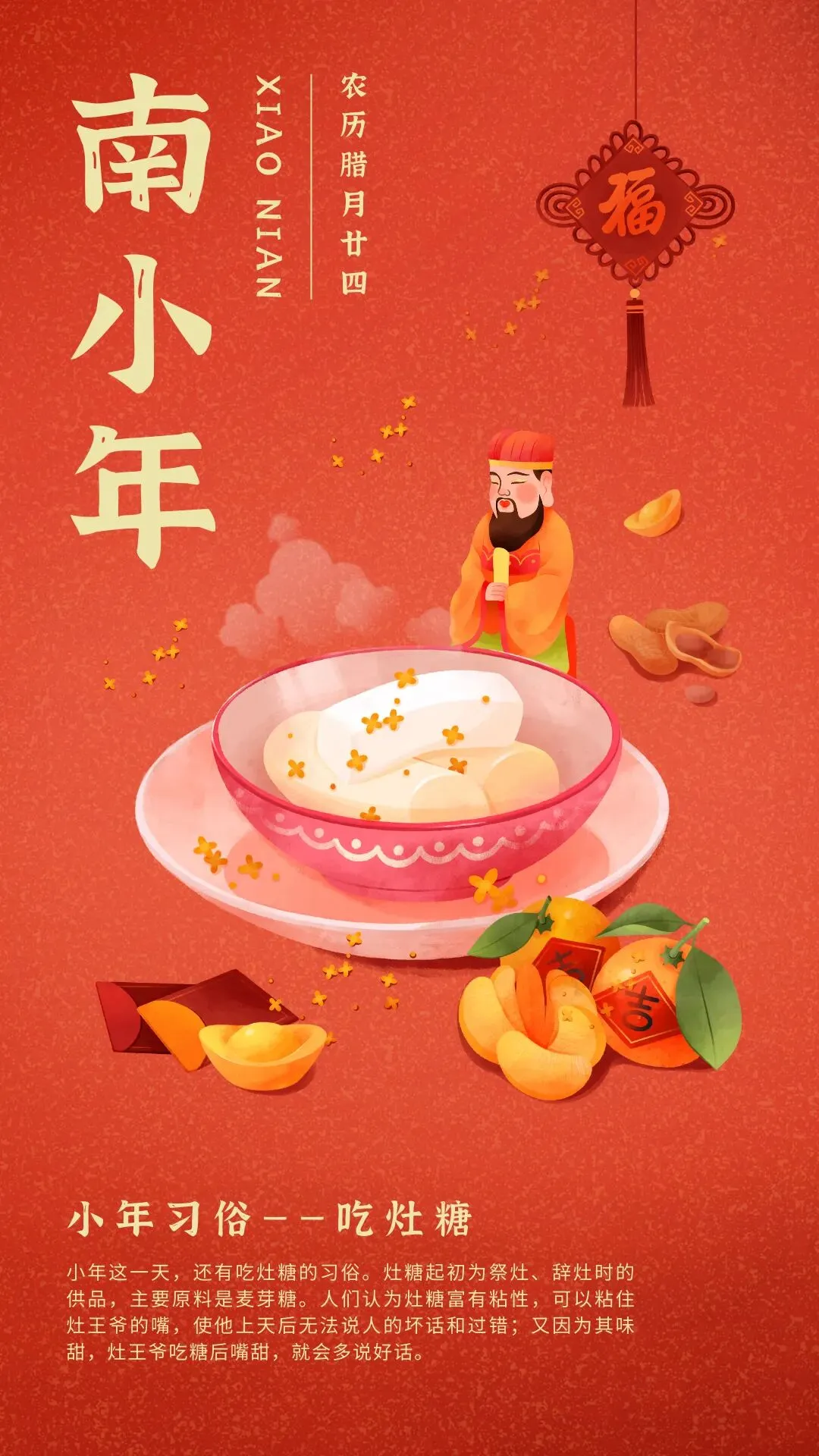 - 民俗复古风:中国红+鎏金配色,融入灶王爷、春联、糖瓜、灯笼等民俗元素,肌理感满满,适配小年民俗科普、传统文化宣传,氛围感直接拉满👏