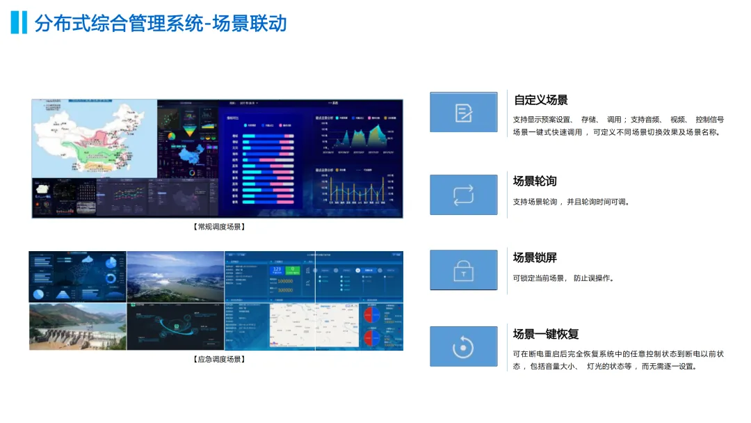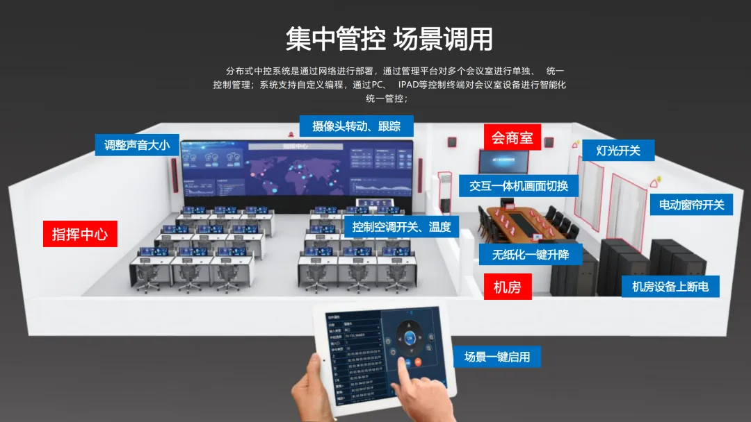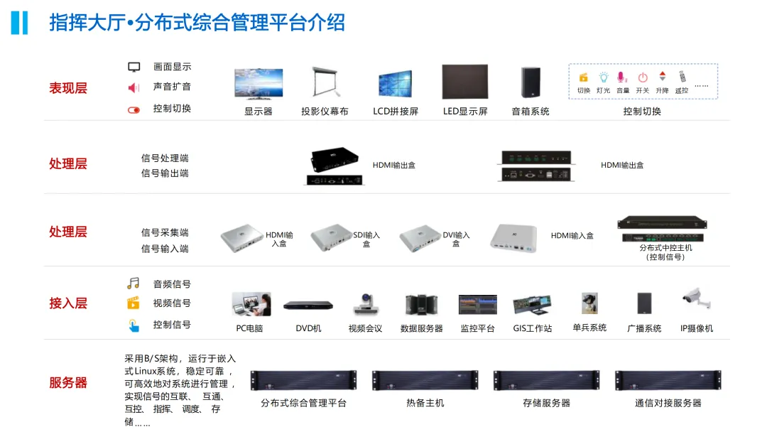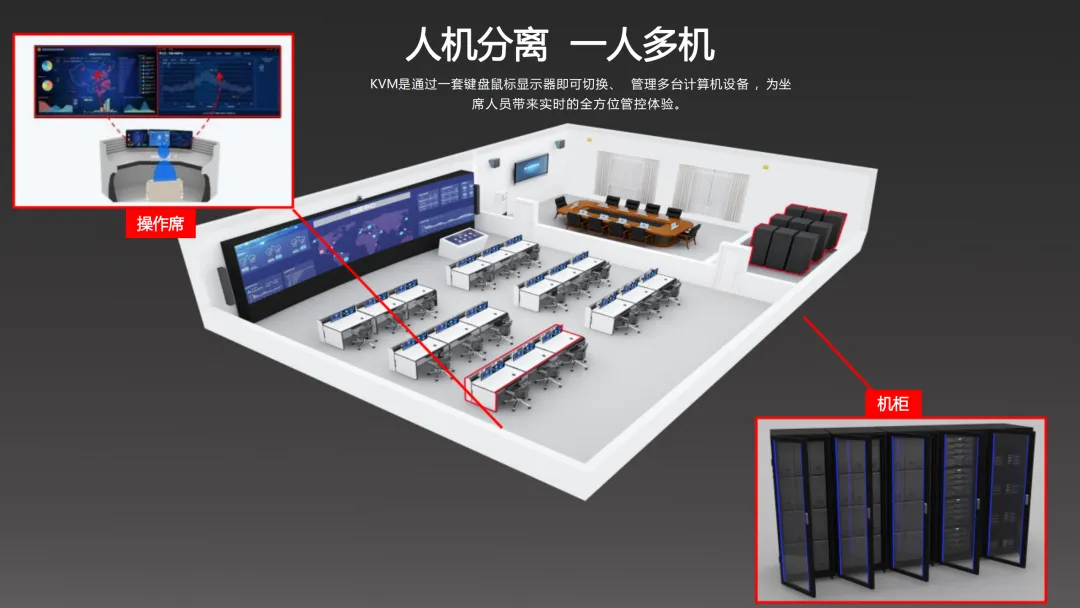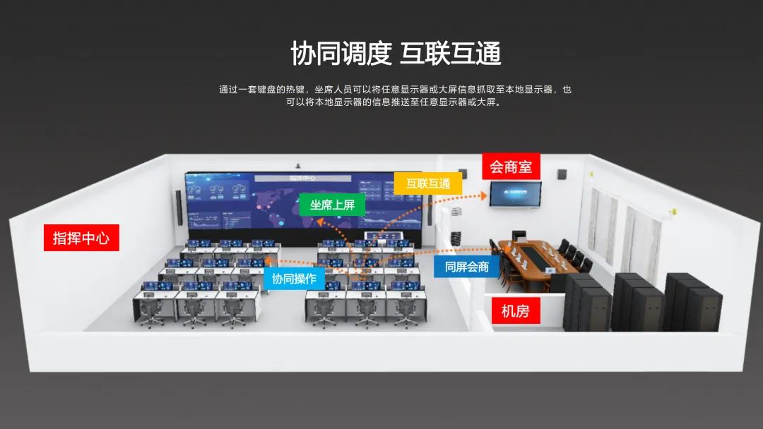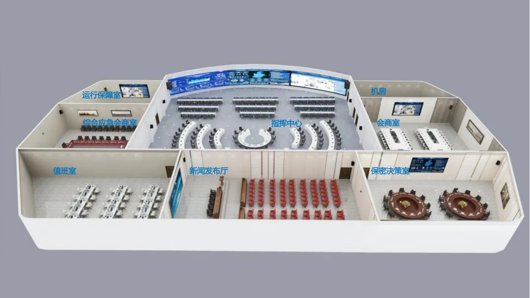 在功能实现上,方案重点建设了智能中控管理系统、LED显示系统、分布式综合管理系统、录播系统、无纸化系统及视频会议系统等关键模块,实现应急指挥调度、媒体信息发布、大数据分析存储及本地与远程会议的无缝对接。同时,通过可视化管控与KVM坐席管理,提升指挥大厅与会商室的运营效率与决策能力。